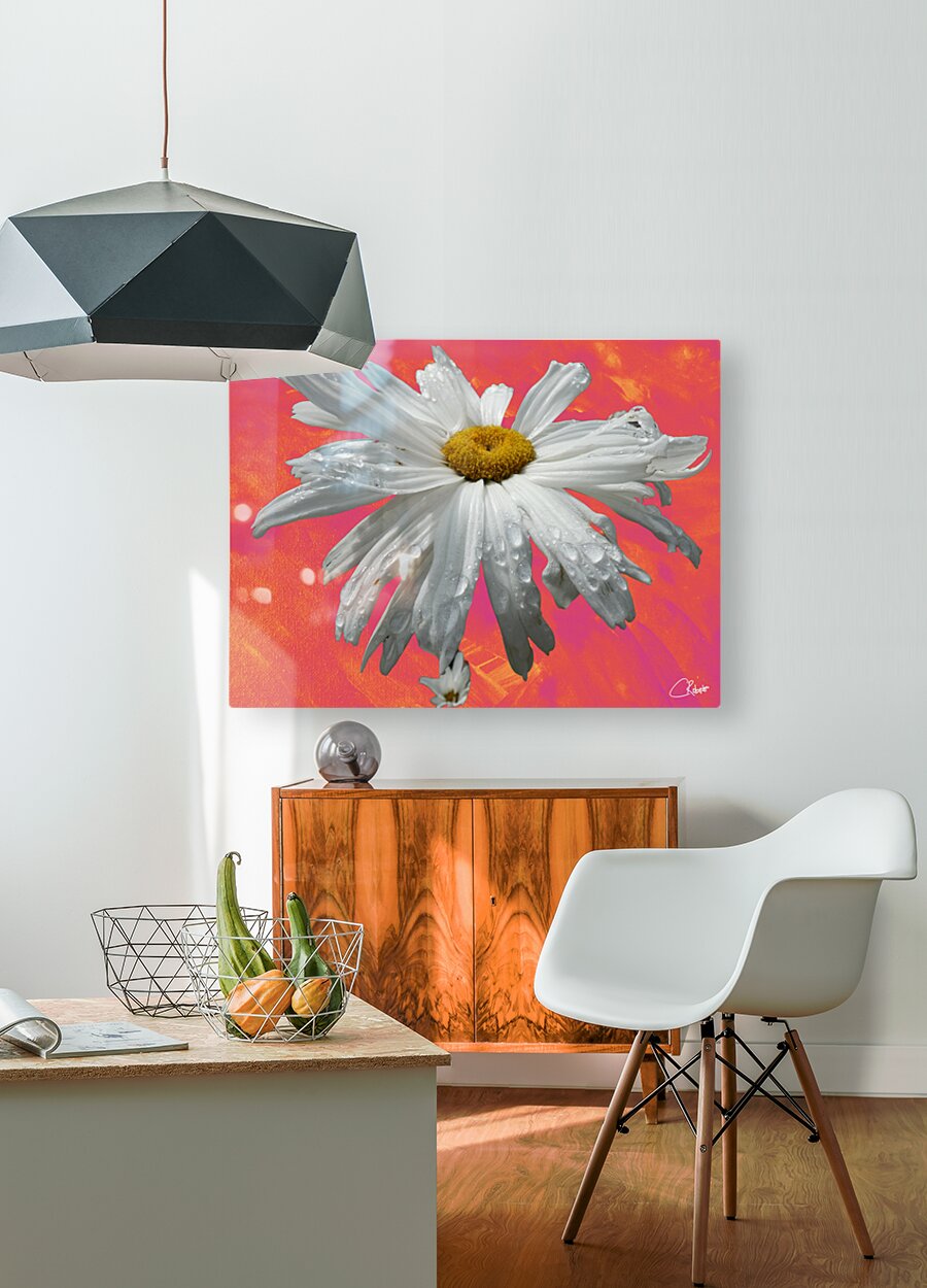 I originally hand painted an acrylic composition, and then photographed a Daisy flower close up, laterally I digitally manipulated both designs combining these to create one unique piece of photographic art.