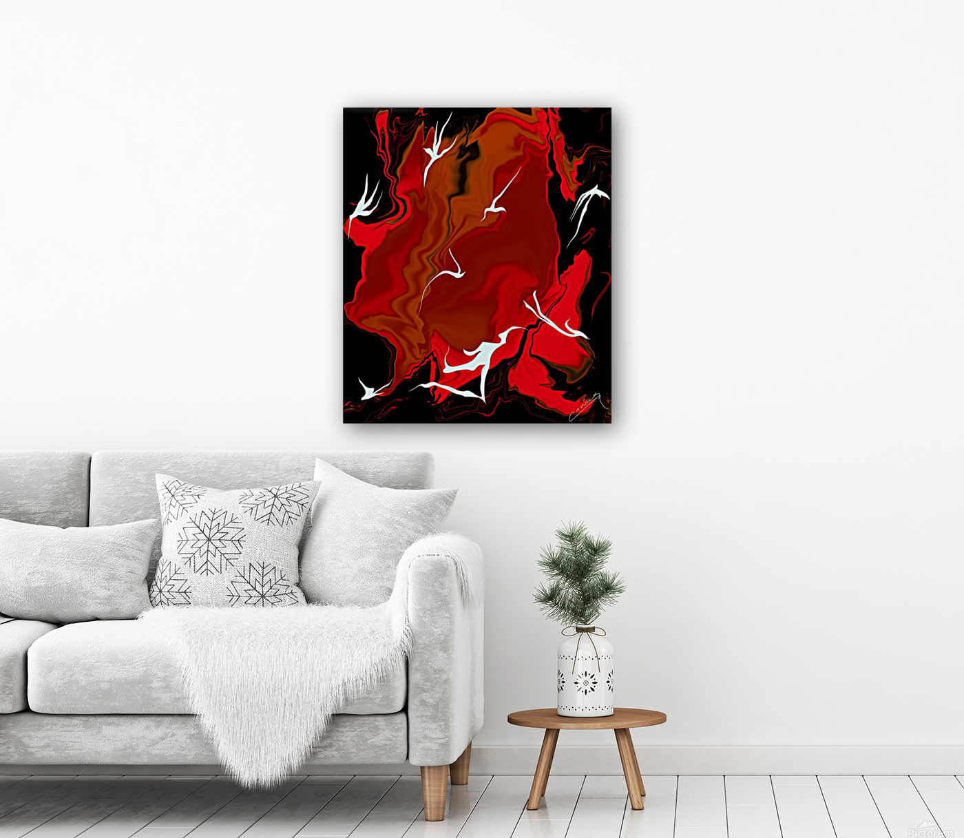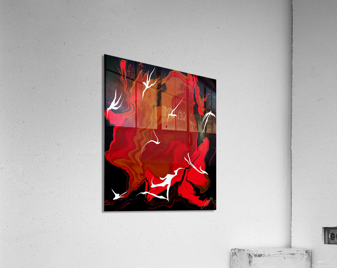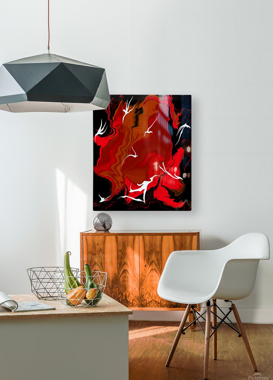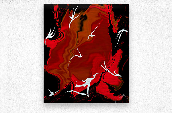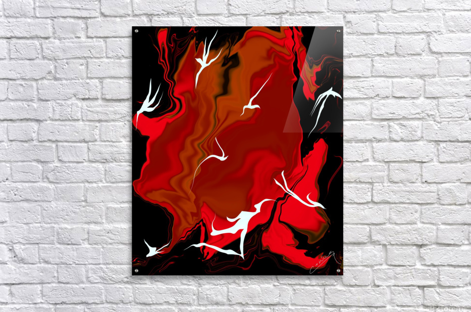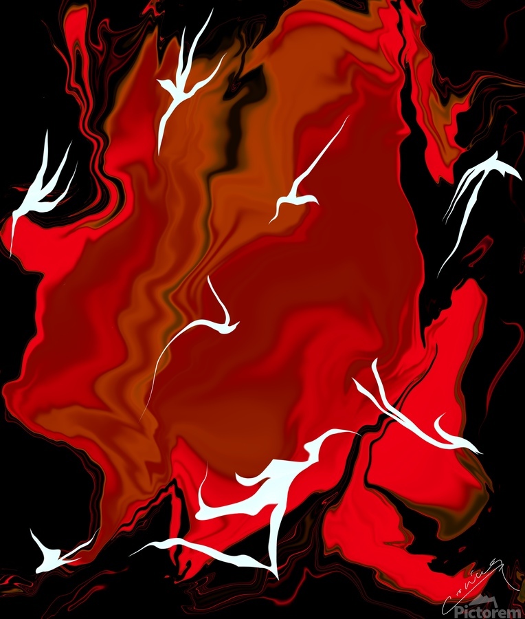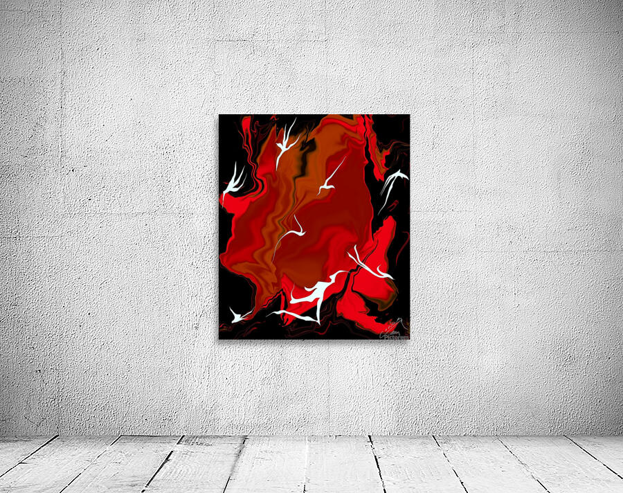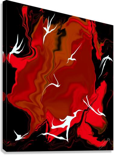 Shop "Enchanting Inferno" – red abstract fiery art with white fairies racing against flames. Limited edition prints on canvas, metal, or giclee.