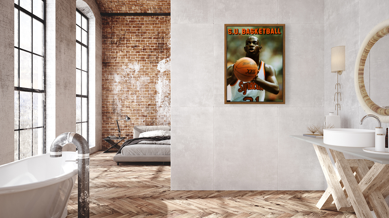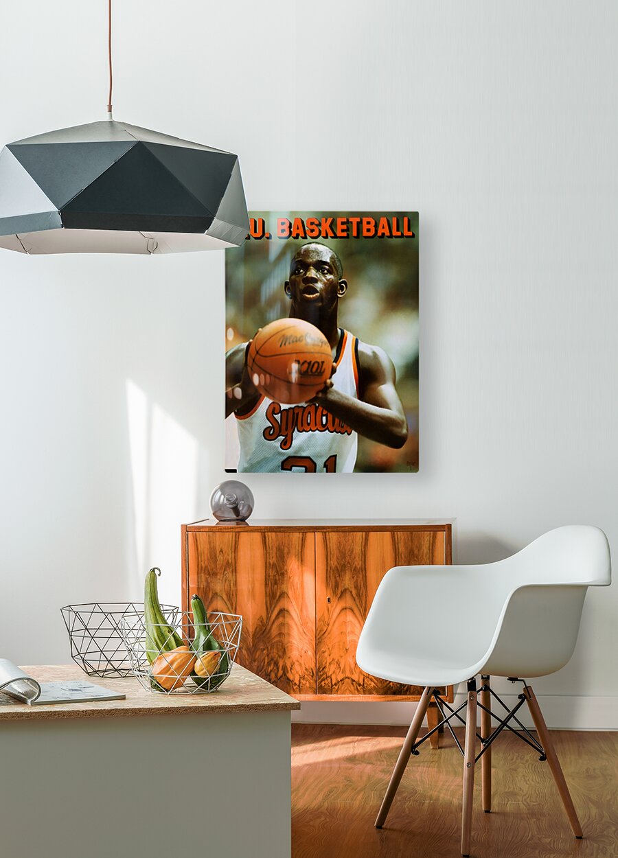 1985 Syracuse Orangemen Basketball Art | Star Dwayne "Pearl" Washington Shoots a Free Throw | #1 High School Player in America in 1983 | Row One | Over 11,000 Collectible Sports Art Pieces and Historic College Art Prints | Created from '85 Syracuse Basketball memorabilia showing Pearl Washington at the line, Row One Brand's Syracuse Basketball throwback art will look fantastic in your game room or office. Derivative art © 2023 Row One Brand This historic college basketball art is not affiliated with, licensed, sponsored, authorized, or endorsed by any college, university, team, league, artist, athlete, other brand, or any licensing entity. This art was created from 1985 memorabilia published without a copyright notice.