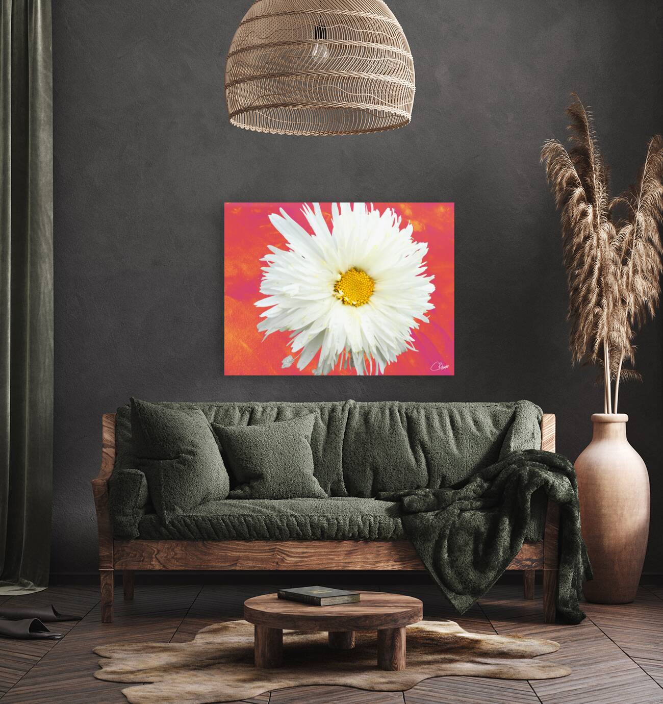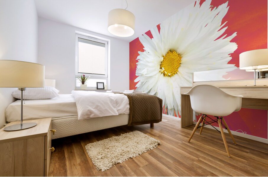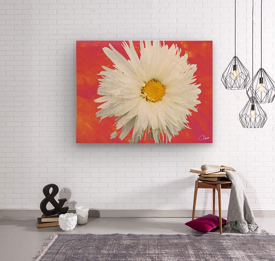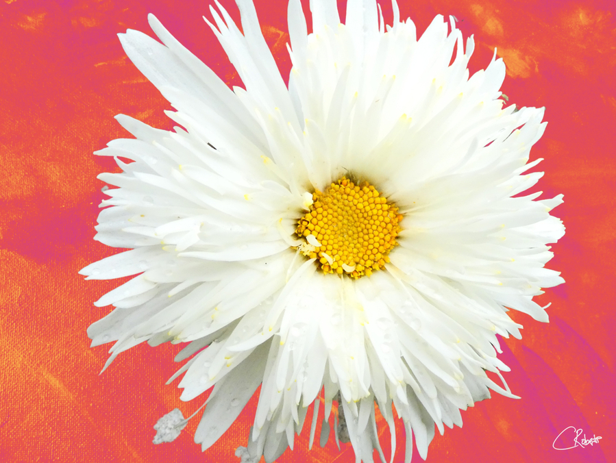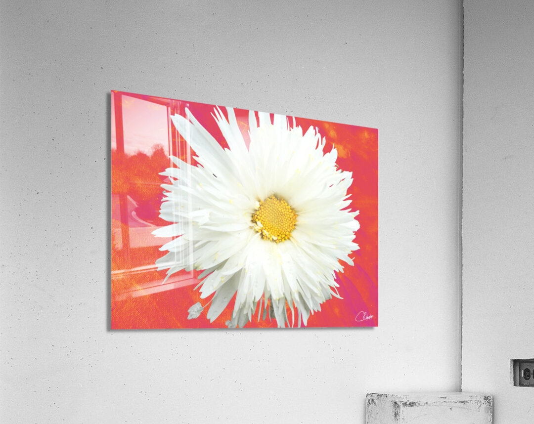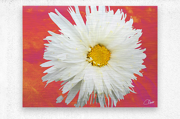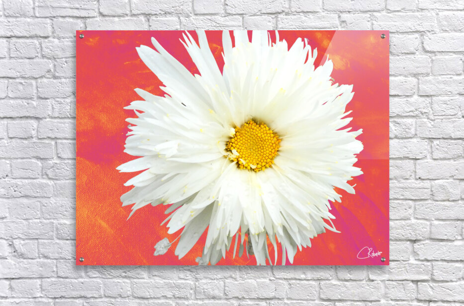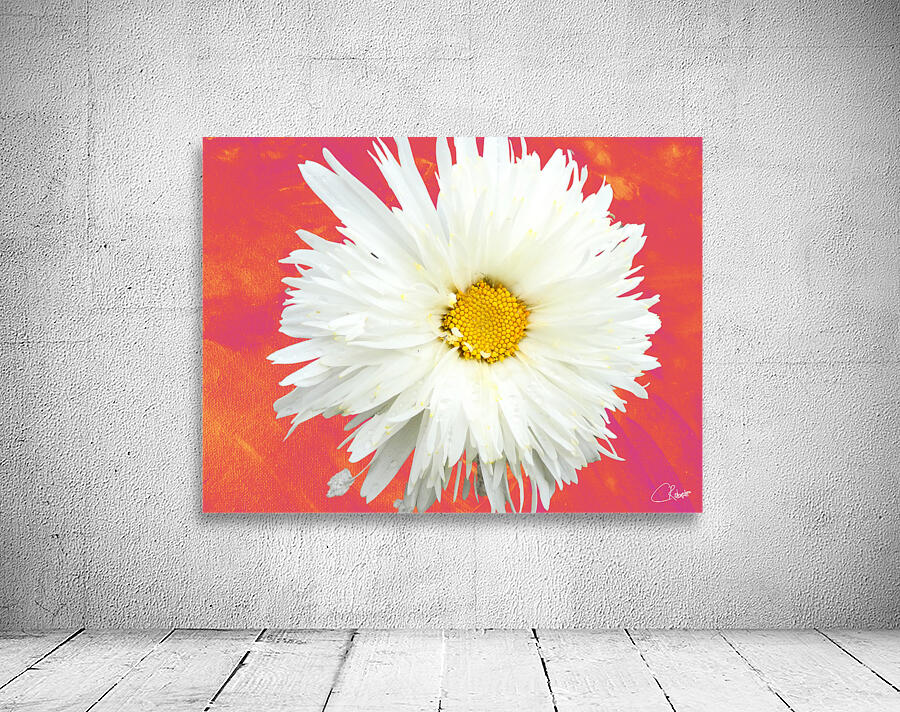 ABOUT THIS ARTWORK: DOUBLE WHITE DAISY FLOWER ON A VIBRANT HEATWAVE ABSTRACT BACKGROUND