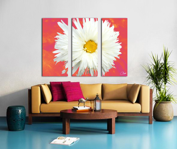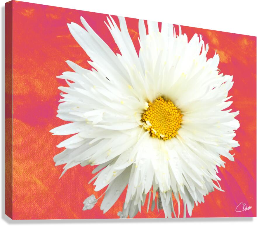 DOUBLE WHITE DAISY FLOWER ON A VIBRANT HEATWAVE ABSTRACT BACKGROUND CATRIONA ROBERTS NATURE PHOTOGRAPHY AND DESIGNS  Canvas Print