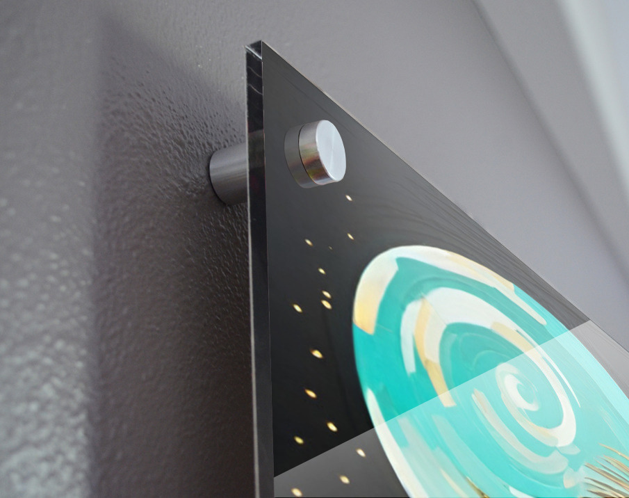 Printed to the edge - Ready to hang - provided with 4 premium polished aluminum stand off ( wall screws and mounting hardware provided )