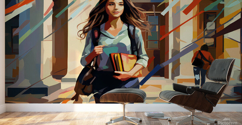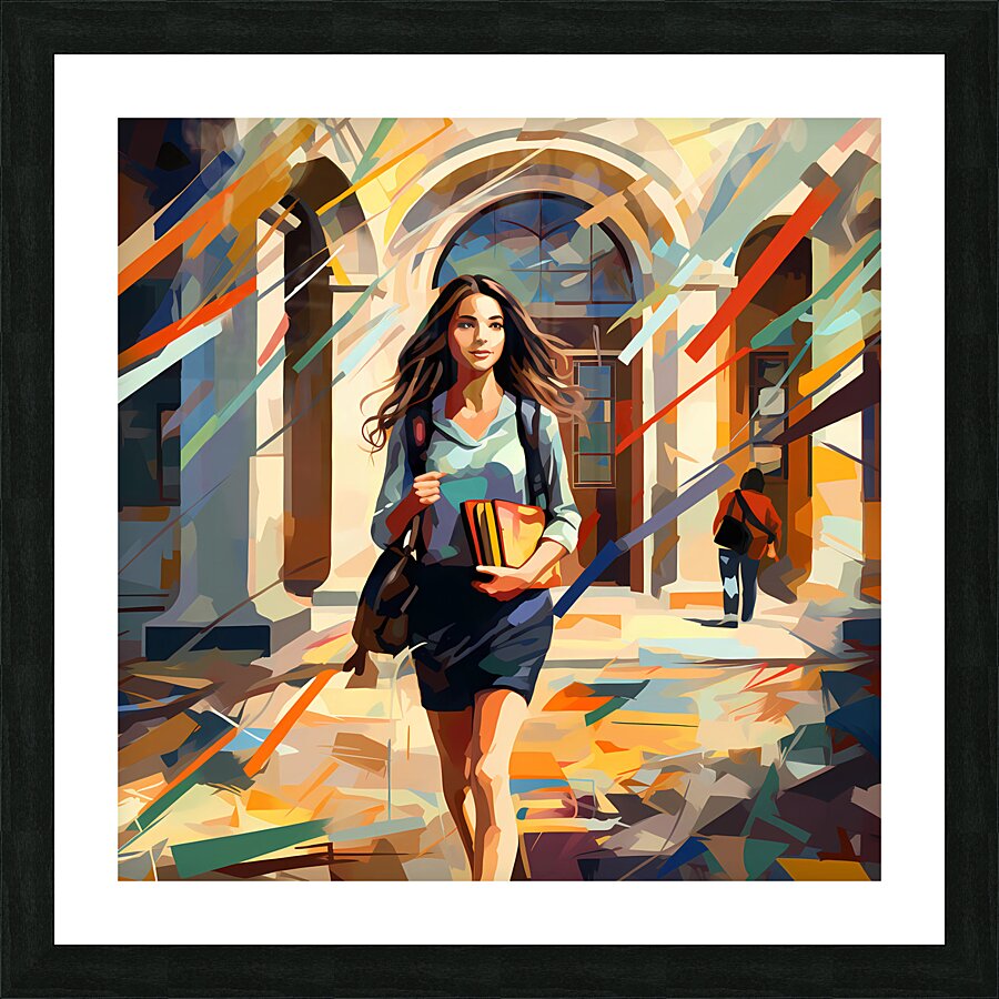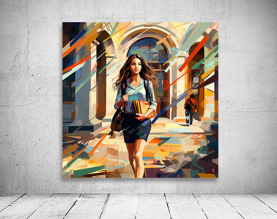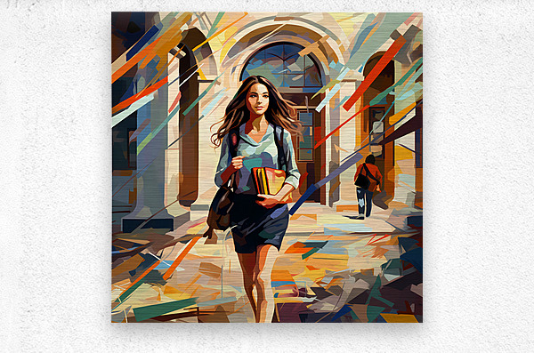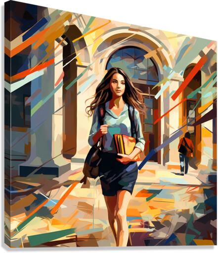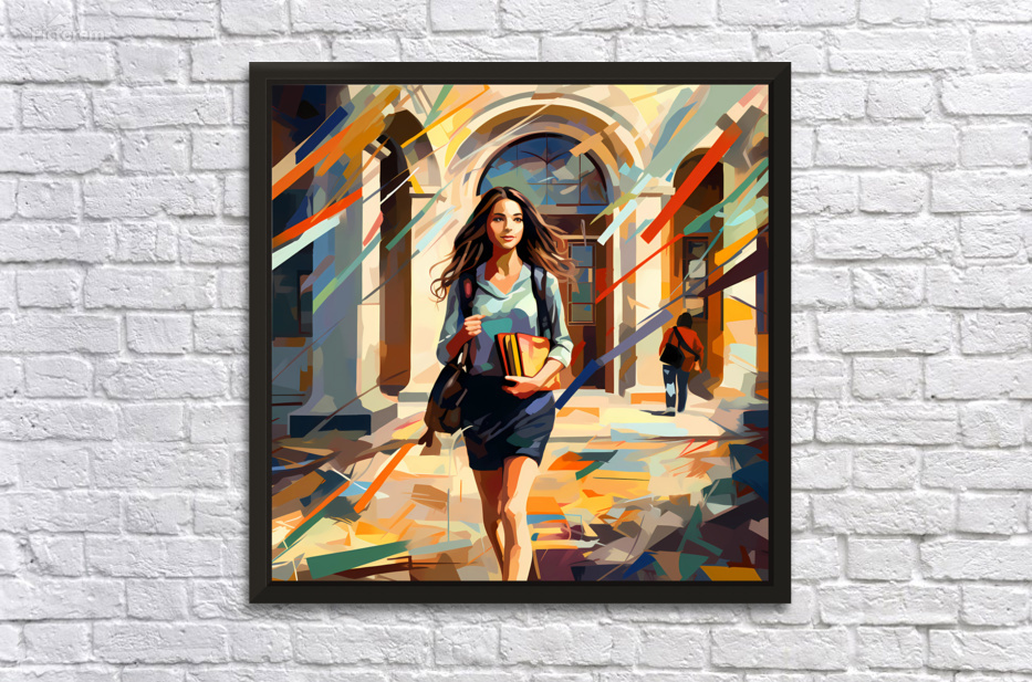 In the captivating depiction titled "The Studious Scholar," the essence of a young and determined scholar springs to life. The scene portrays a confident and slightly smiling young woman as she progresses down a corridor, with each step metaphorically symbolizing the unfurling potential of her brilliant mind. Carrying books that serve as emblems of knowledge and growth, she advances along a path illuminated by the radiant light of her aspirations. The subtle curve of her smile mirrors the optimism that accompanies her on this journey of intellectual discovery. Every stride she takes echoes the blossoming of her talents and the promise of a future marked by achievements. The vibrant colors and skillful portrayal within this depiction capture the energy and vitality emanating from her every step. "The Studious Scholar" stands as a visual testament to the power of education, determination, and the innate potential of a young mind. It invites viewers to witness the transformative nature of learning and the beauty that arises when confidence and curiosity walk hand in hand. This portrayal serves as a reminder that every step forward represents progress toward realizing the boundless opportunities that lie ahead in the realm of knowledge and personal growth.