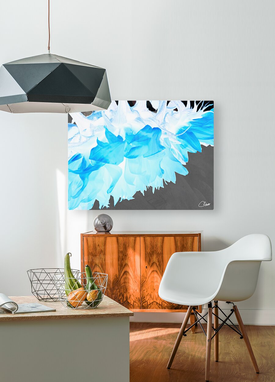 Combining two designs, a close up photo of Sunflowers and a hand painted abstract acrylic, followed by digital manipulation, enabled this stunning floral work to emerge.