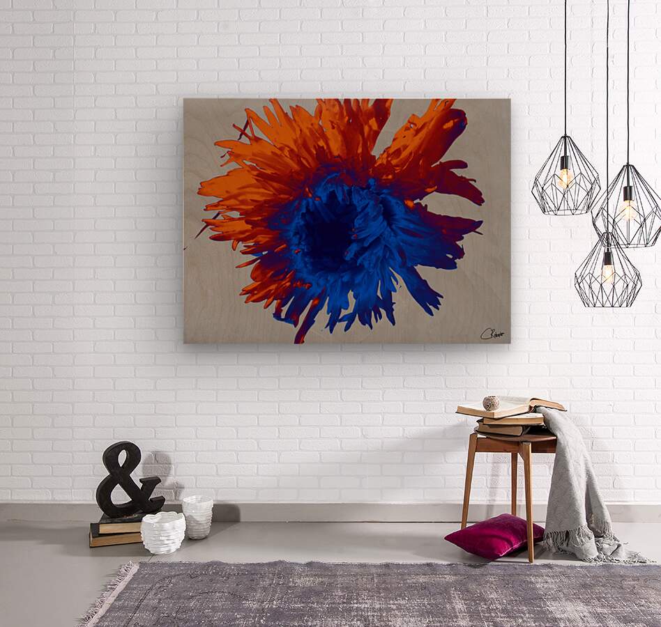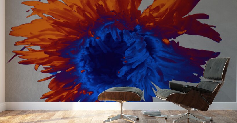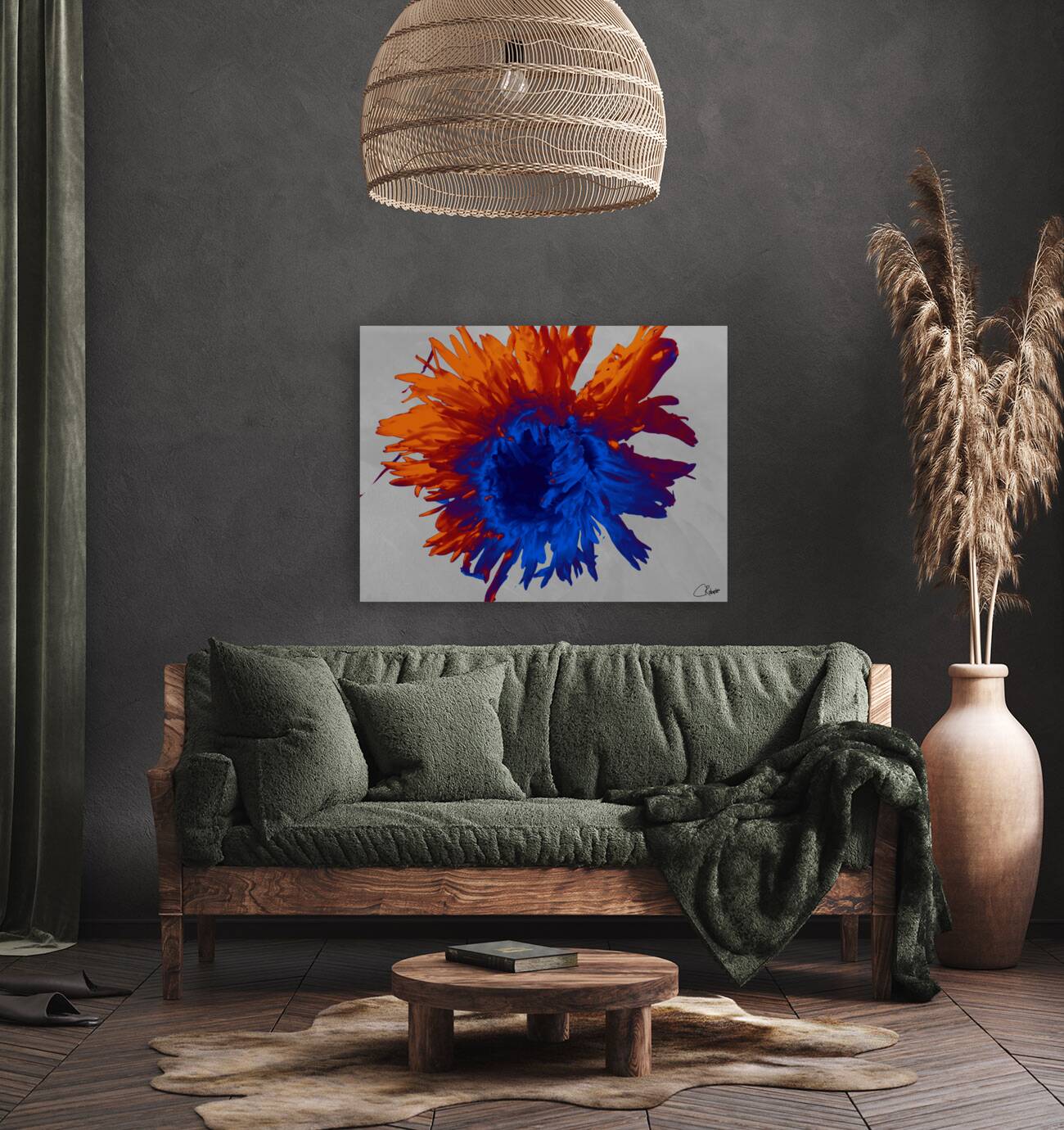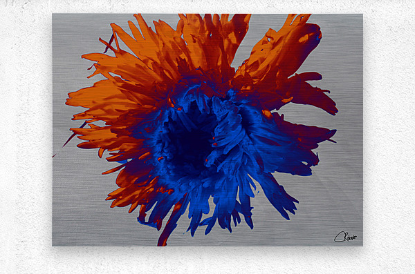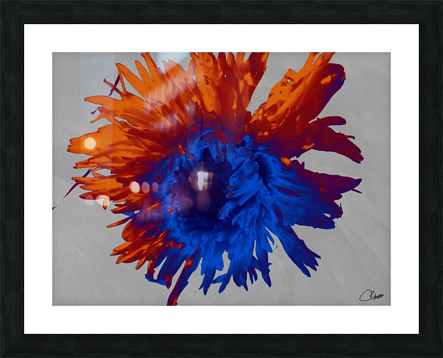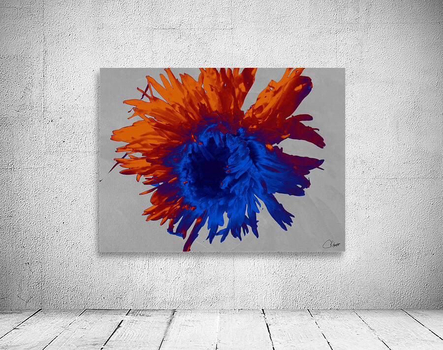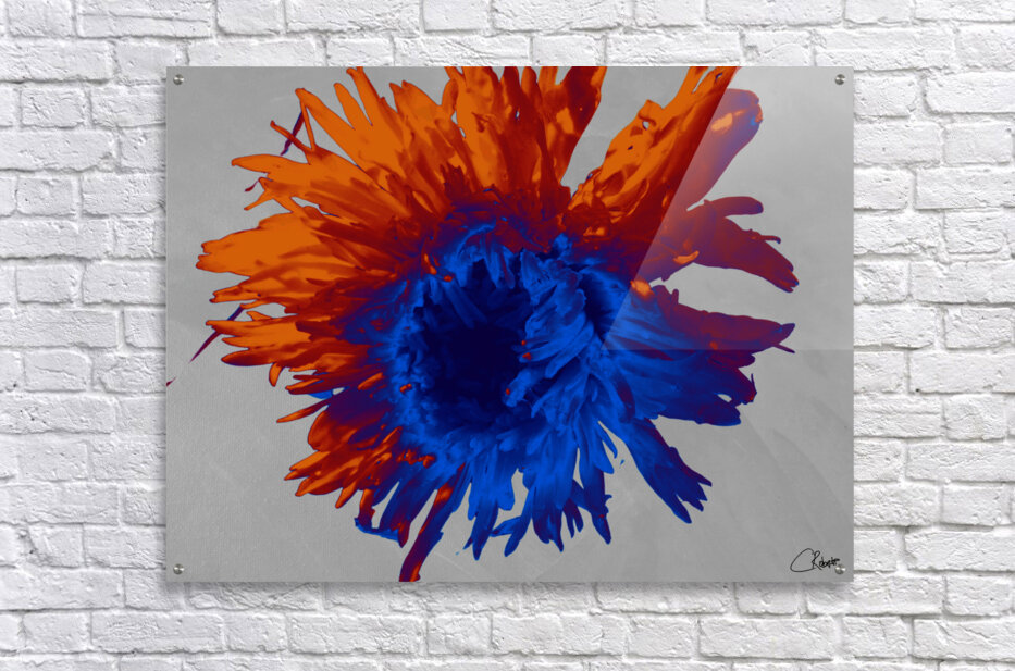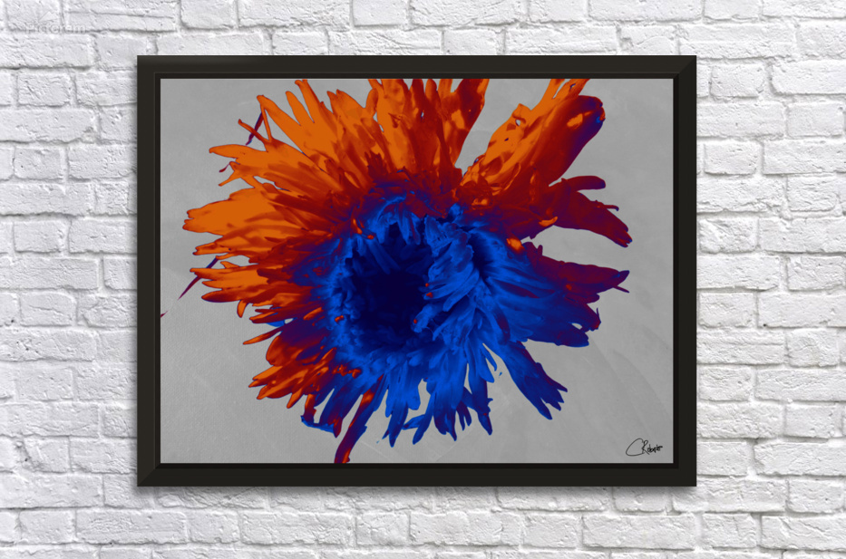 Fusing two designs in one, a close up photo of a Chrysanthemum flower with a hand painted acrylic background, enabled this stunning floral art work to emerge.