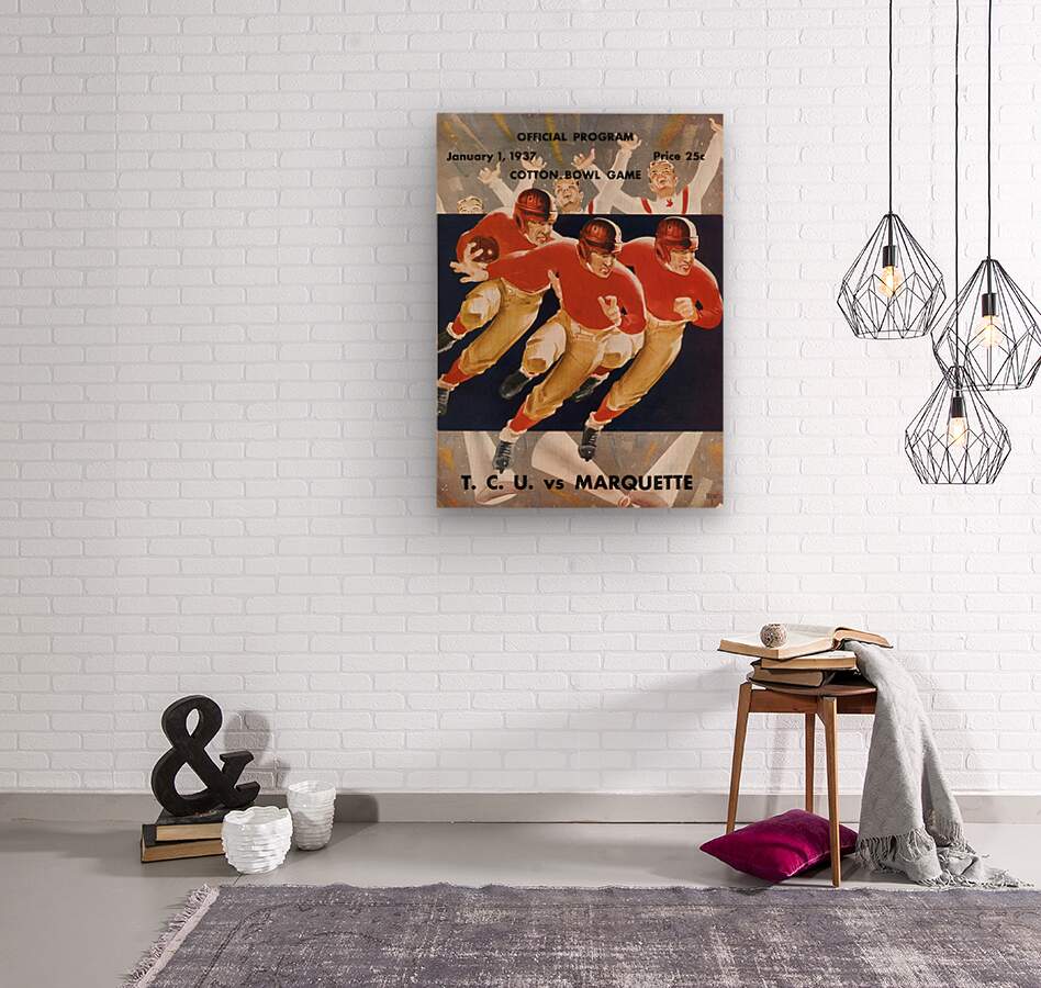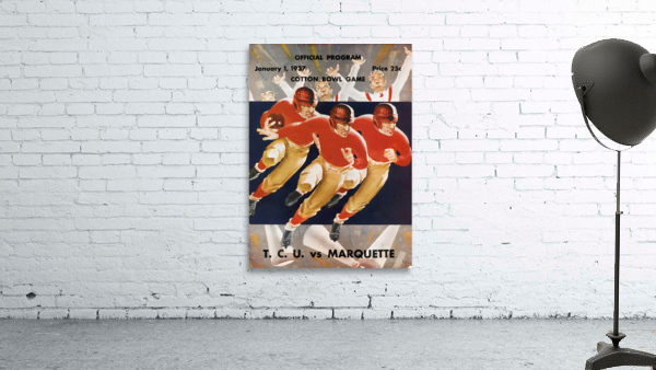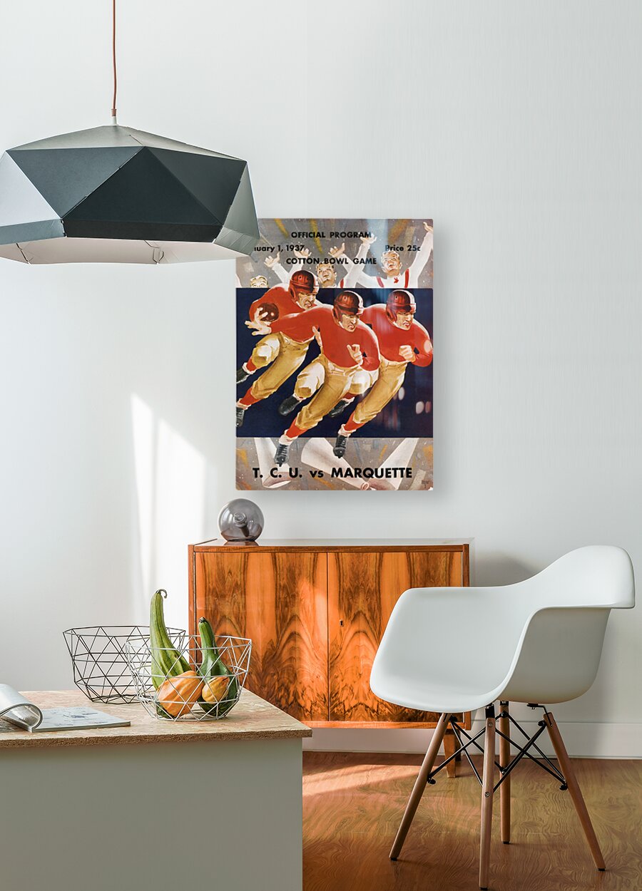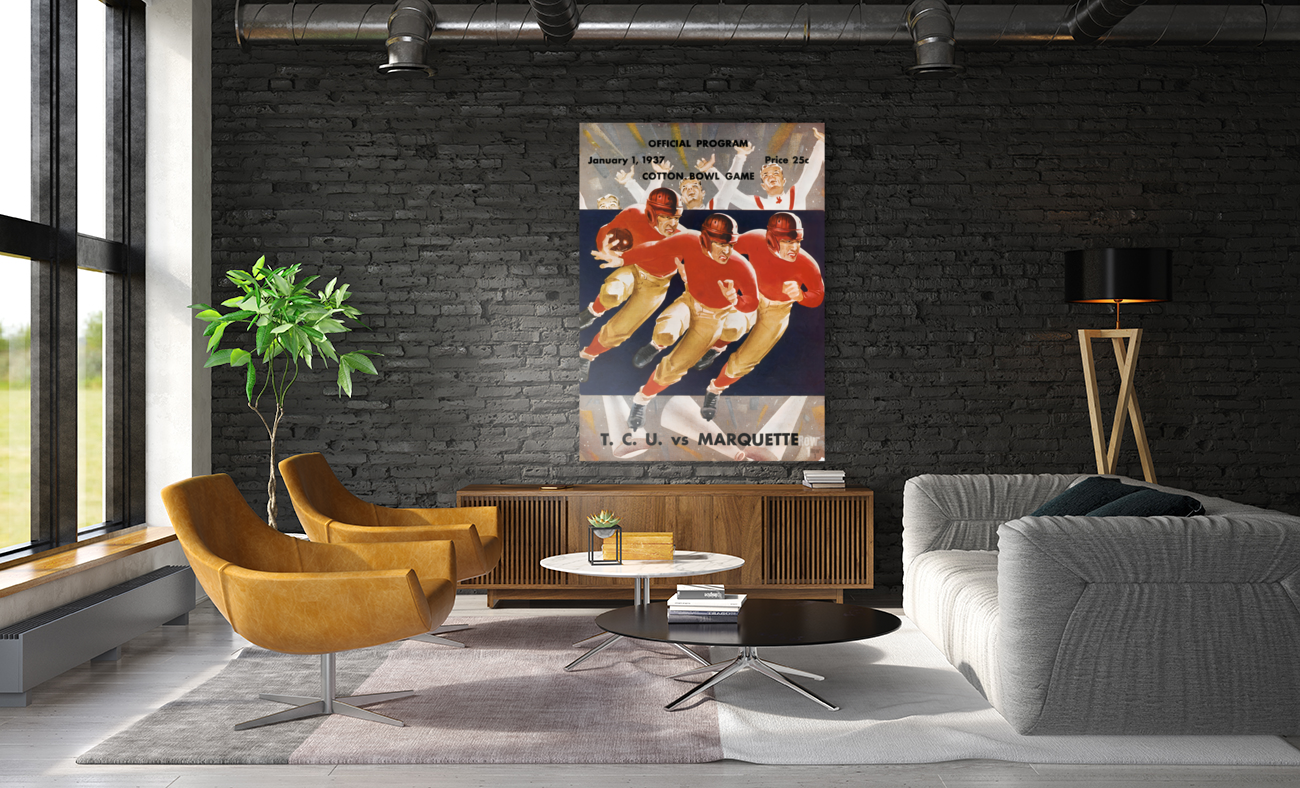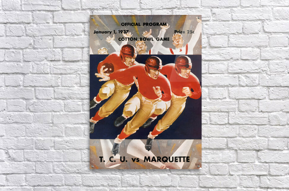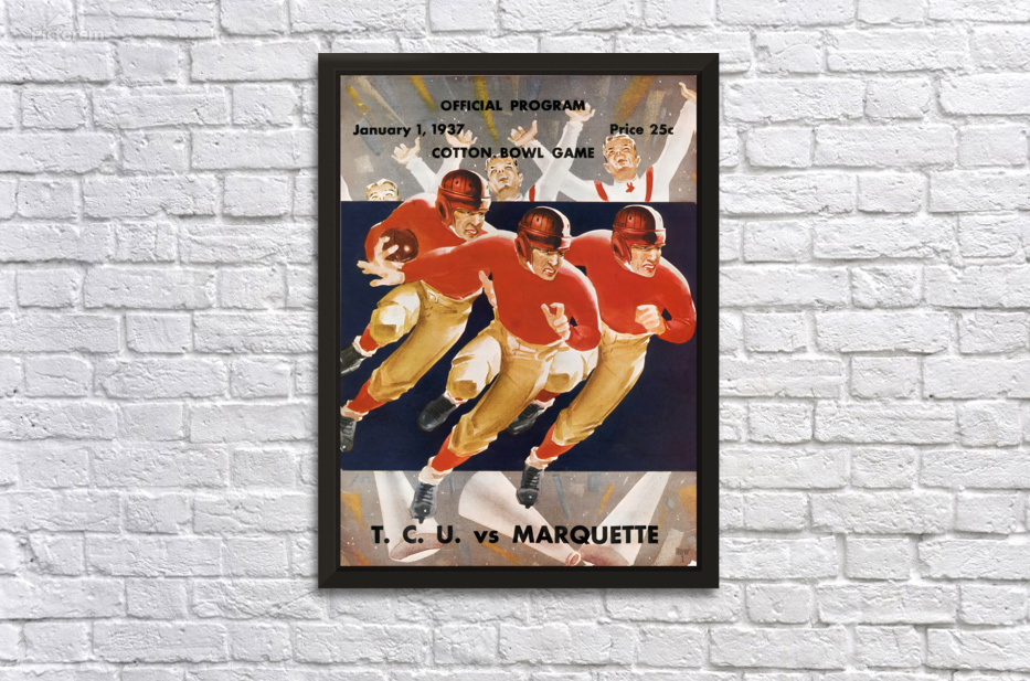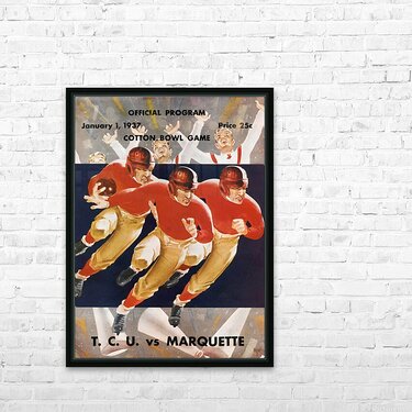 1937 Cotton Bowl Program Cover Art | TCU Horned Frogs vs. Marquette Golden Avalanche | TCU Won 16-6 | Row One | Over 11,000 Collectible Sports Art Pieces and Historic College Art Prints | Created from authentic '37 Cotton Bowl cover artwork, Row One Brand's '37 Cotton Bowl football program art will look fantastic in your game room or office. Derivative art © 2023 Row One Brand This historic college football art is not affiliated with, licensed, sponsored, authorized, or endorsed by any college, university, team, league, artist, other brand, or any licensing entity.