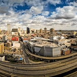 Framed by super highways and the Mississippi River, New Orleans presents a stunning morning visual cityscape view, with Caesars Superdome on the left, The Crescent City Connection Bridges on the right and the The National WWII Museum in the front center. The Mississippi River is located immediately in back of the skyscrapers along the horizon. The city is both vibrant and colorful, especially during Mardi Gras weeks when we visited.