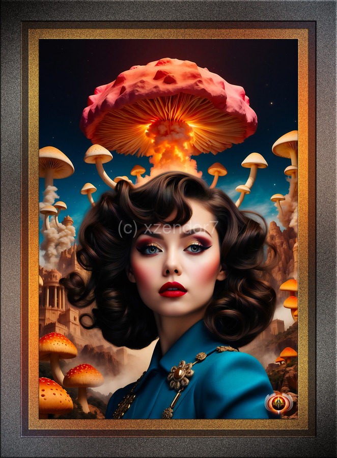 ABOUT THIS ARTWORK: ATOMIC MUSHROOMS BARBENHEIMER RETRO FUSION CAPTIVATING PORTRAIT ART AI CONCEPT CREATION BY XZENDOR7