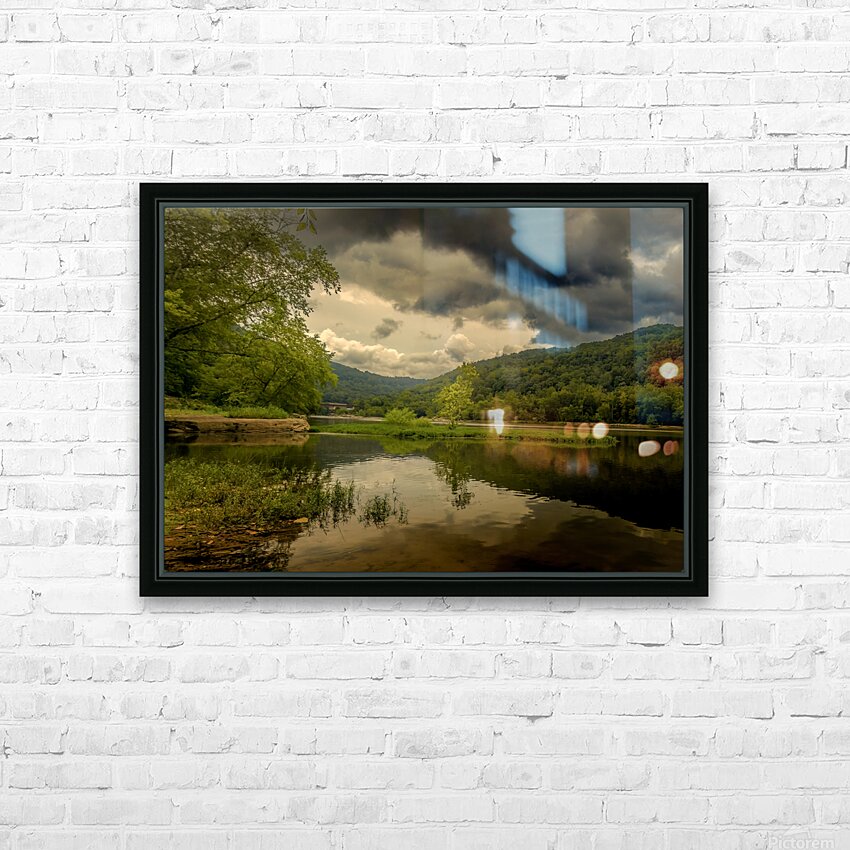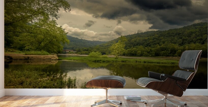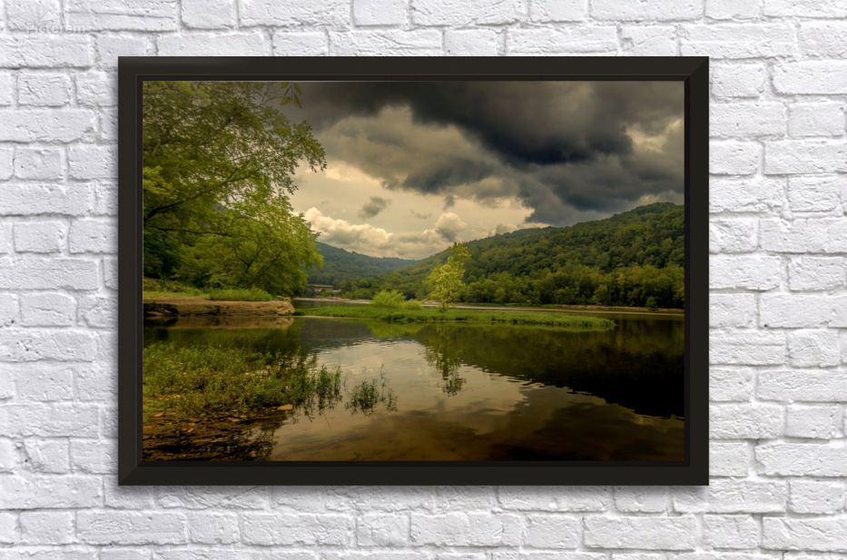 Pictured is the New River in West Virginia, mirrored reflections of storms overhead and a tiny tree on a river island at the intersection of the Gauley River in summer. The river is calm and still, and the images of the trees and clouds on the water are perfect. The sky is a dramatic mix of blue and gray, with dark storm clouds gathering overhead emphasizing the tiny tree. The sun's glow is highlighting the island tree reflecting the golden glow on the river. The view has a romantic feel to it creating a sense of peace and tranquility. The storm clouds overhead add a touch of drama and excitement. The overall effect is a photo that is both beautiful and romantic. #newriver #westvirginia #gauleyriver #gauleyriverbridge #cathedralfalls #westvirginianature #ElegantFinePhotography #normabrandsberg