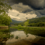Pictured is the New River in West Virginia, mirrored reflections of storms overhead and a tiny tree on a river island at the intersection of the Gaule...[+]