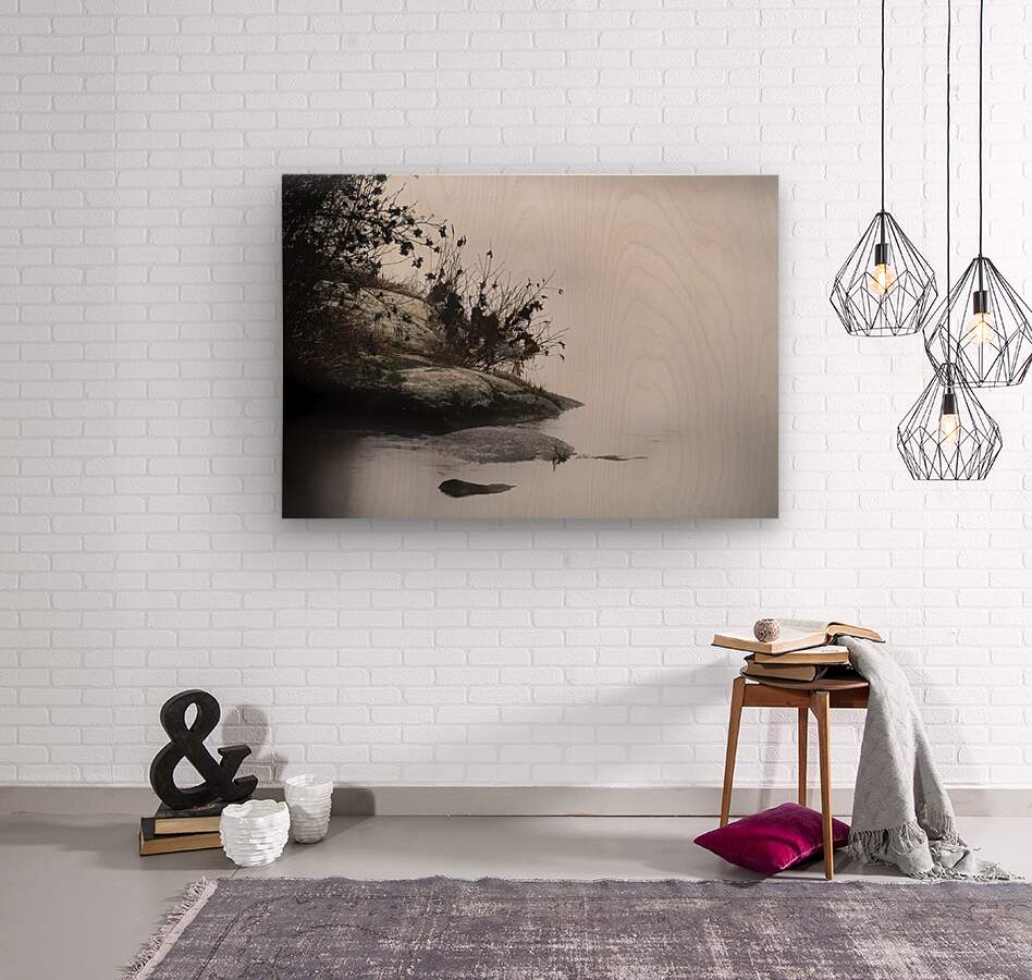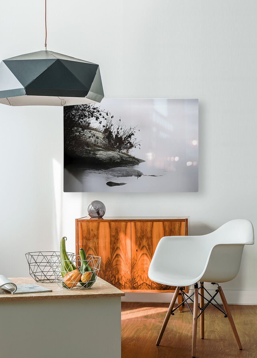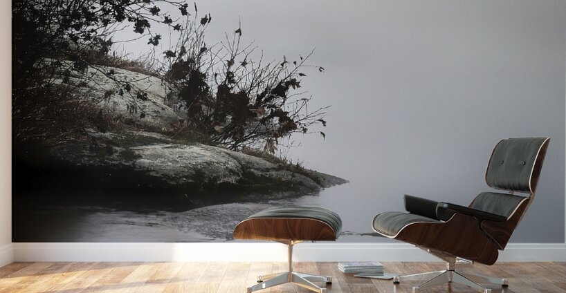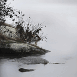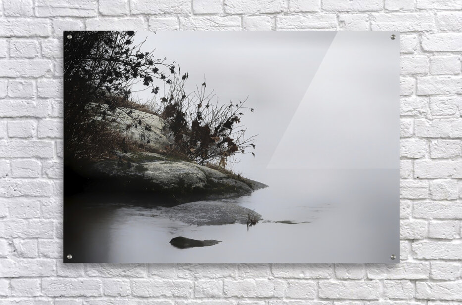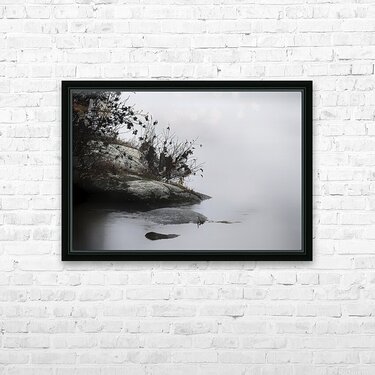 Foggy Point presents a serene and misty landscape, featuring a rocky shoreline with sparse vegetation, including some branches and small plants. The calm water creates a reflective surface that merges seamlessly with the hazy, fog-filled background. The overall tone is soft and subdued, emphasizing tranquility and quietness. Subtle gradients in the mist and reflections in the water add depth and a dreamlike quality to the scene. The composition gently leads the viewer's eye from the foreground to the background, highlighting the peaceful atmosphere of the natural setting. Inspired by the gentle flow of a river, the soft light created by the fog, and the texture of the rocks and plants, this piece captures the essence of a tranquil moment in nature.