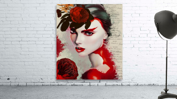 Shop "Femme Fatale Blooms" – A striking vintage portrait featuring a woman with flowers and icy blue eyes. Limited edition print on canvas, metal, o...[+]