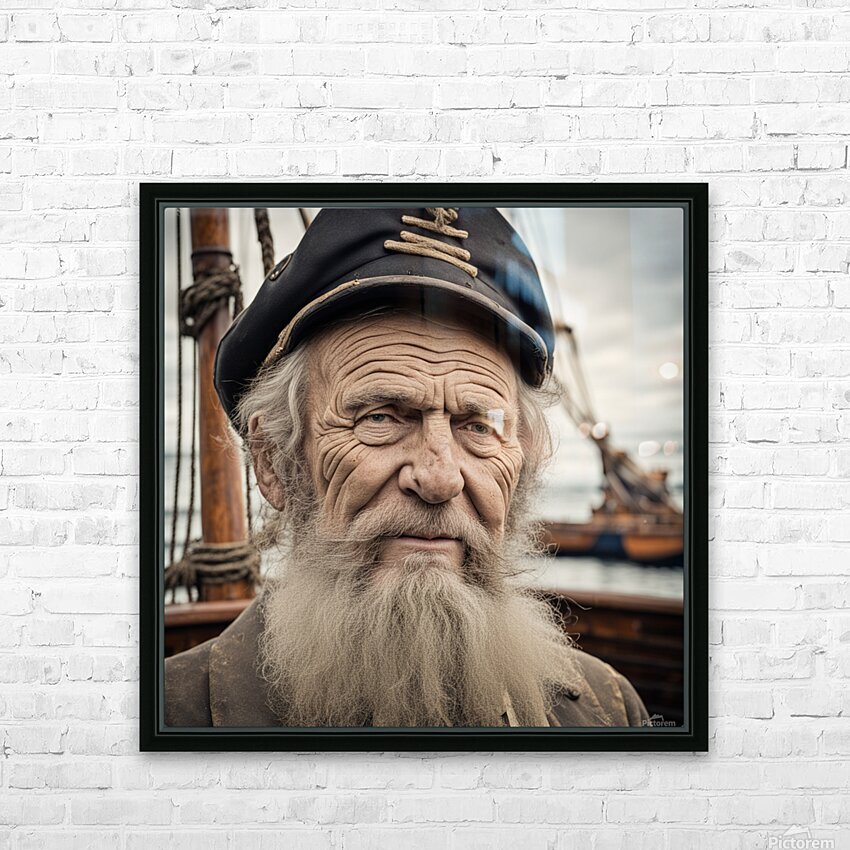 Old sailing ship captain face weathered with old wooden sailing ship in background  Picture Frame Printing