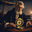 Old sailing ship captain looking at his old brass compass night time with ruff ocean behind him