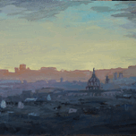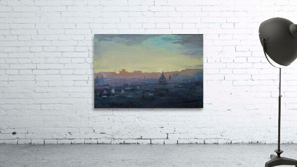 The horizon glows with the tender hush of evening, a veil of gold fading into lavender shadows. The city lies beneath, softened and blurred, its monuments and rooftops emerging like half-remembered dreams. A domed spire rises at the center, steady against the fading light, a sentinel of history and time. The brushwork is delicate yet assured, dissolving the city’s hard edges into atmosphere, where buildings seem less like structures and more like whispers of presence. Warm dusk tones embrace cool twilight blues, a marriage of day’s last breath and night’s first stirring. It is not the city itself that is painted here, but its soul—the way it lingers in memory when the light has shifted, when detail yields to mood, and the familiar becomes eternal.