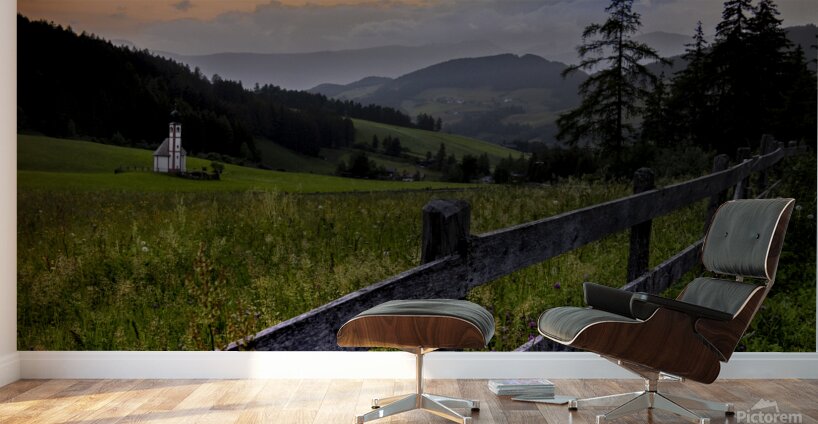 ABOUT THIS ARTWORK: VAL DI FUNES CHURCH AT SUNSET MOUNTAIN VIEWS