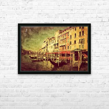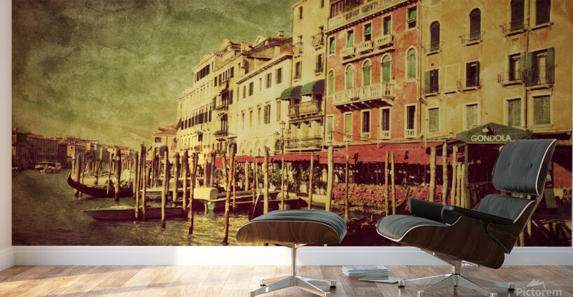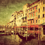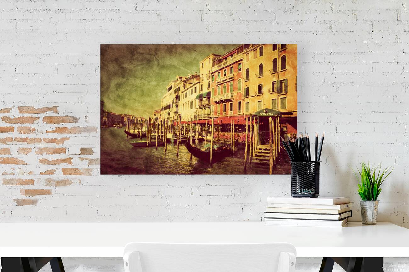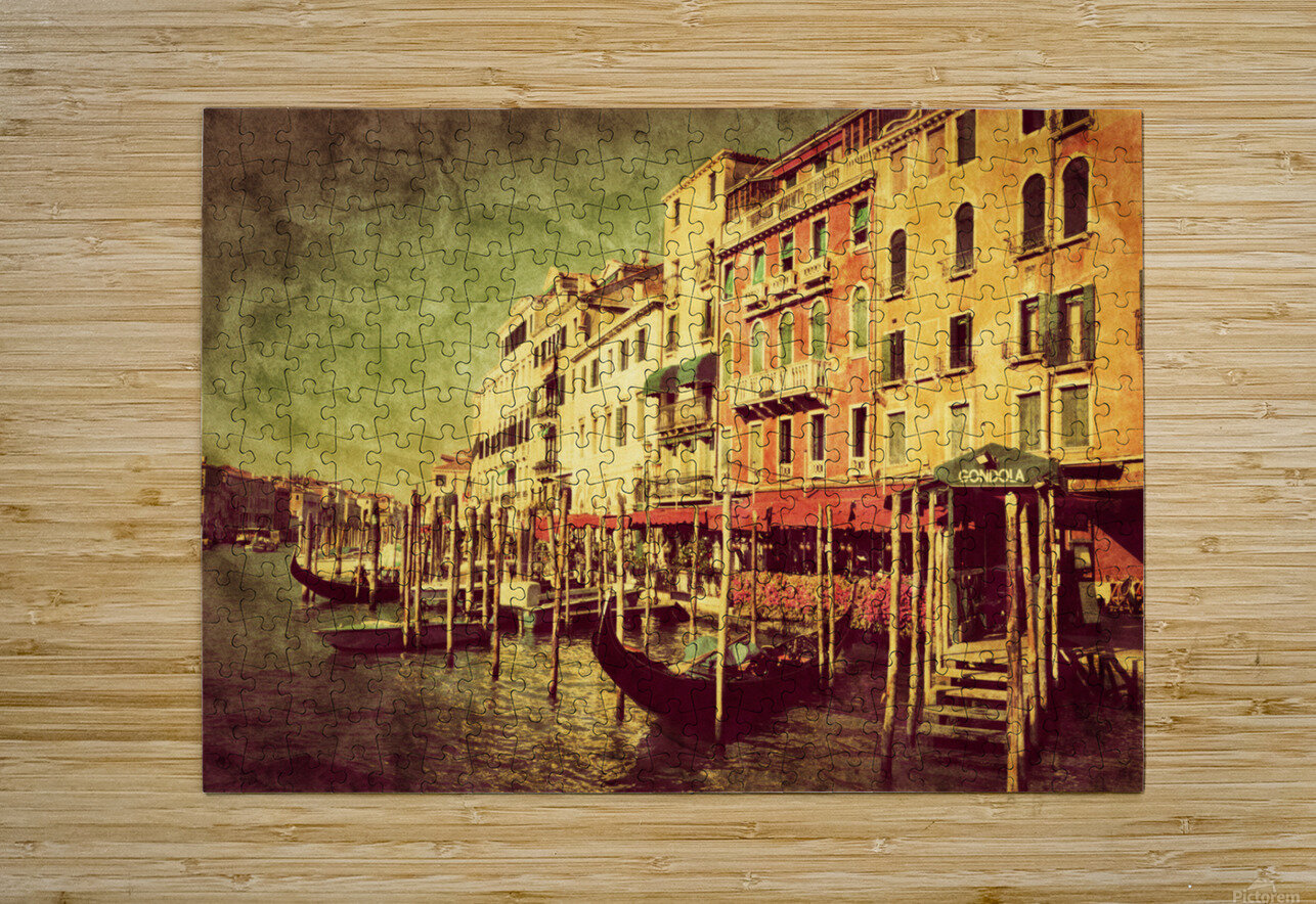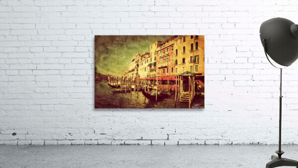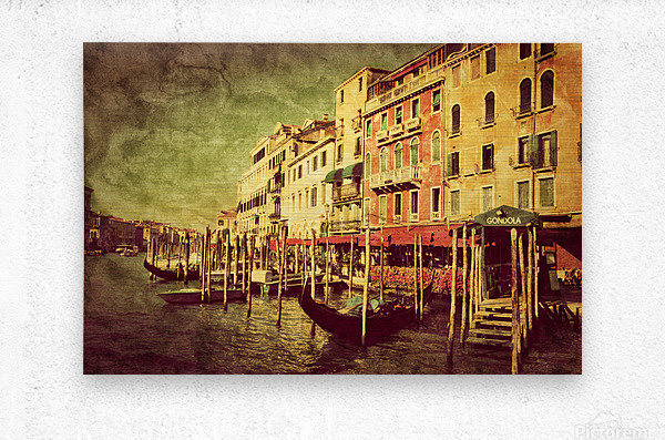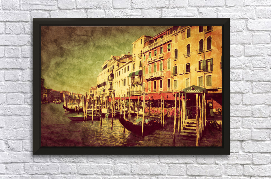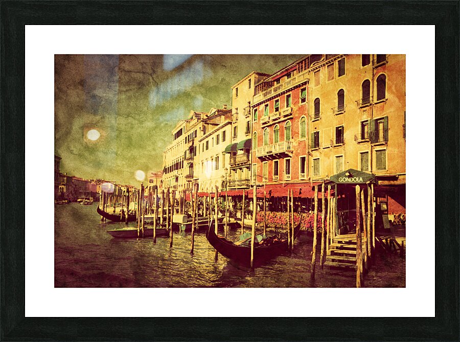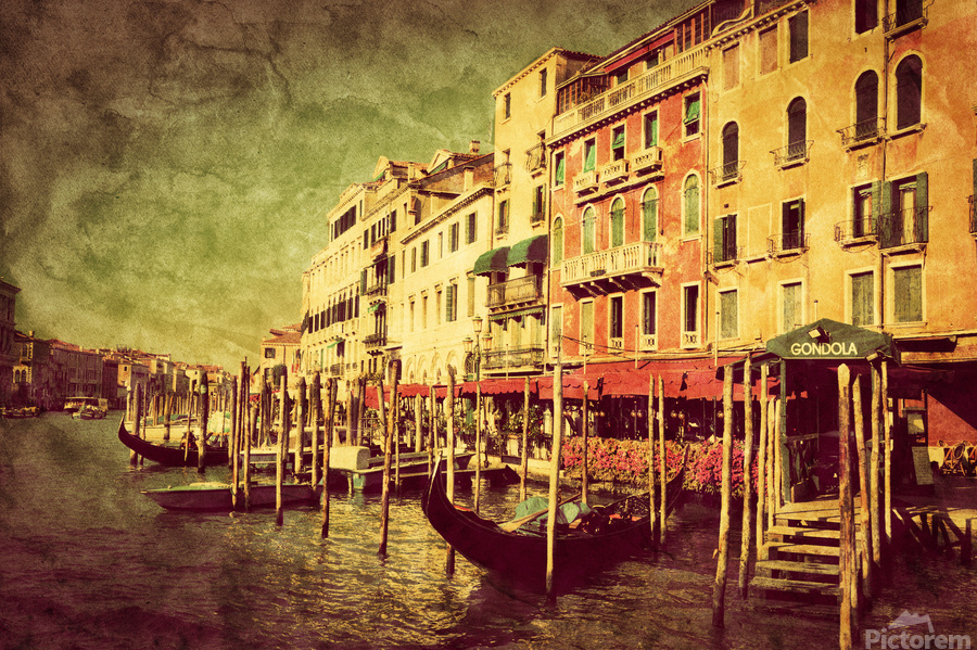 Vintage art of Venice Grand Canal Italian Canal Grande and gondola small harbor. Retro canvas.