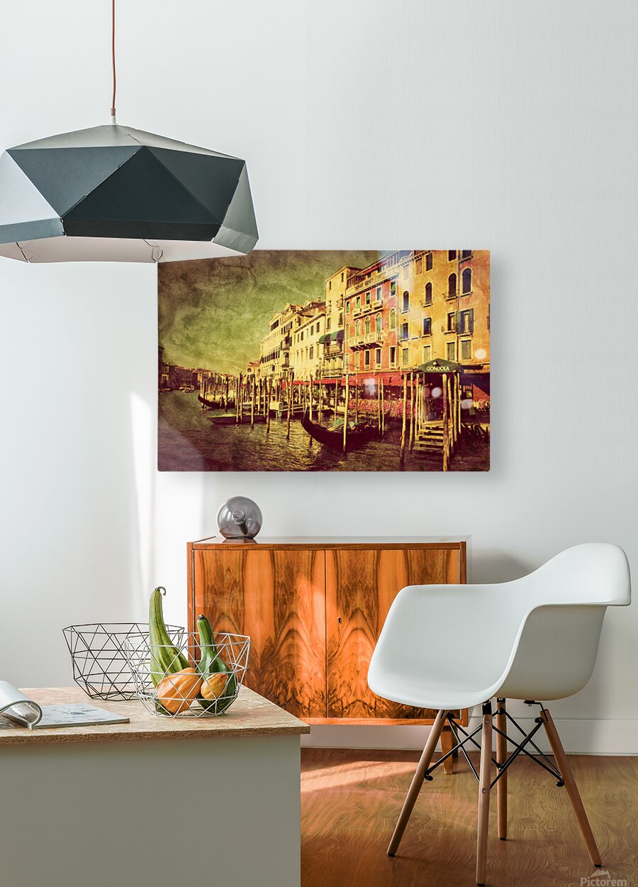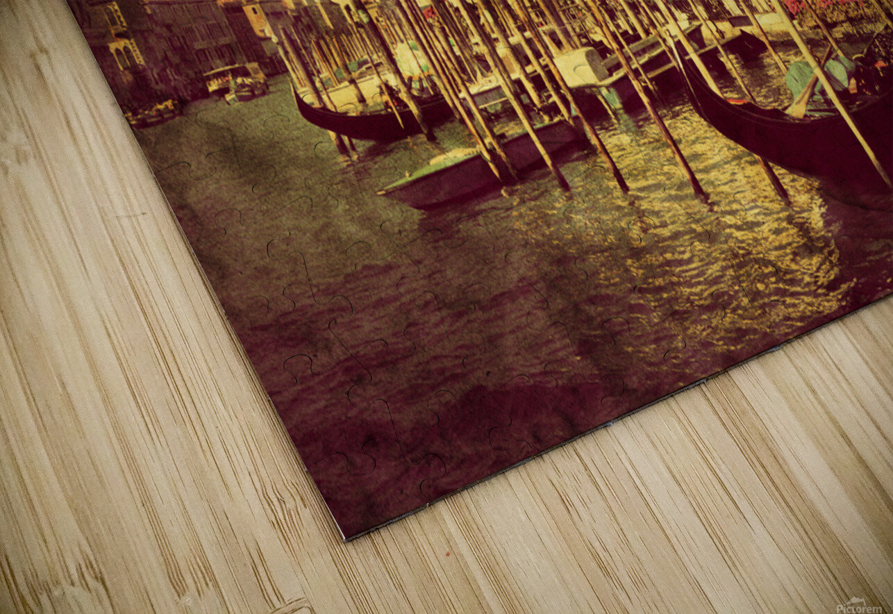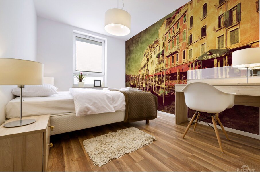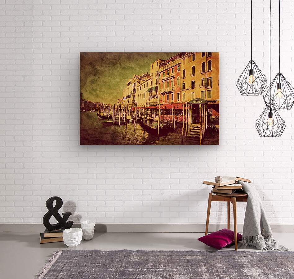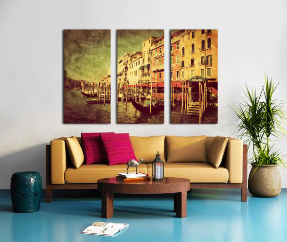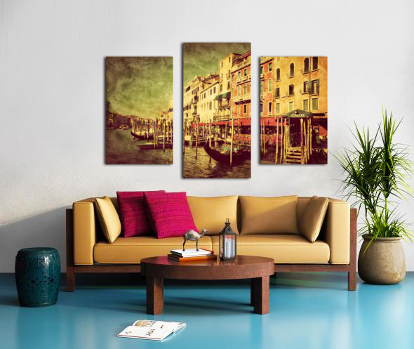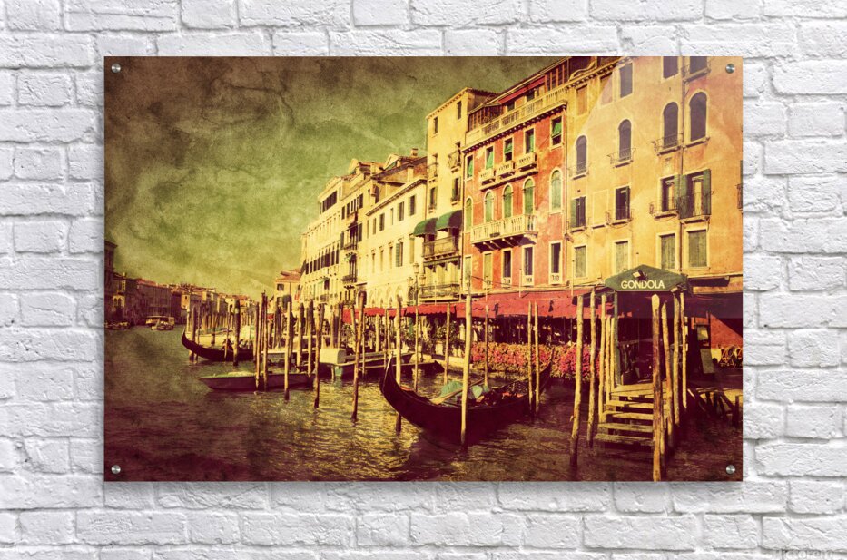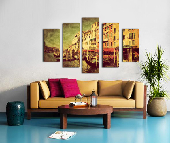 Vintage art of Venice Grand Canal Italian Canal Grande and gondola small harbor. Retro canvas.