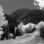 Magical Aspen view in Colorado, part of the Rocky Mountains, around Ouray, Mount Sneffels and the Dallas Divide.. Down a gravel back road bordered by Yellow and Orange Aspen Trees being lit by the late afternoon sun like jewels on a Christmas tree. As the sunset lighting hits the yellow leaves the glow is mesmerizing leading the eye down the road toward the navy blue mountains silhouetted against the sky. Available in color, but this black and white is equally stunning.