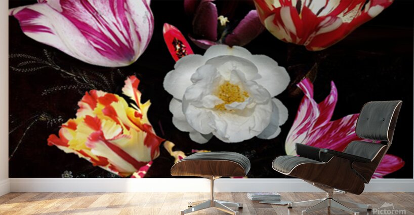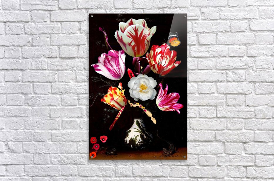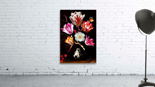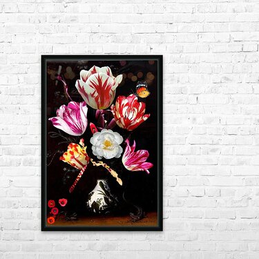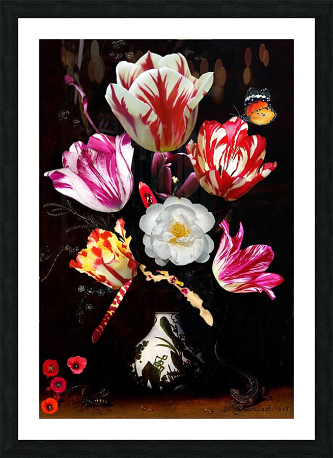 Get this artwork "STILL LIFE WITH VARIEGATED TULIPS IN A CERAMIC VASE WITH A WASP DRAGONFLY BUTTERFLY & LIZARD" in a framed print.