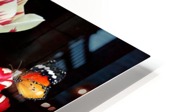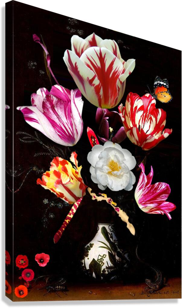 STILL LIFE WITH VARIEGATED TULIPS IN A CERAMIC VASE WITH A WASP DRAGONFLY BUTTERFLY & LIZARD GERRY CHAPLESKI  Canvas Print