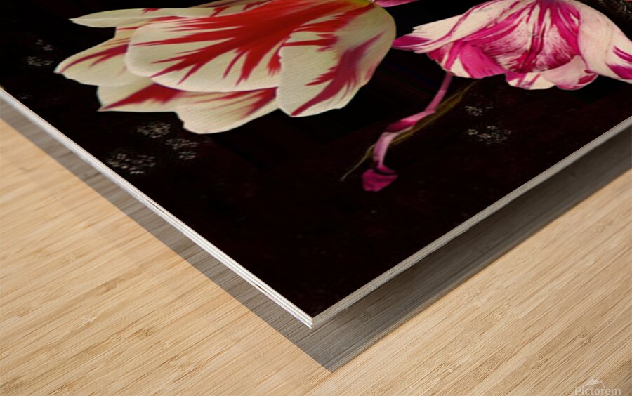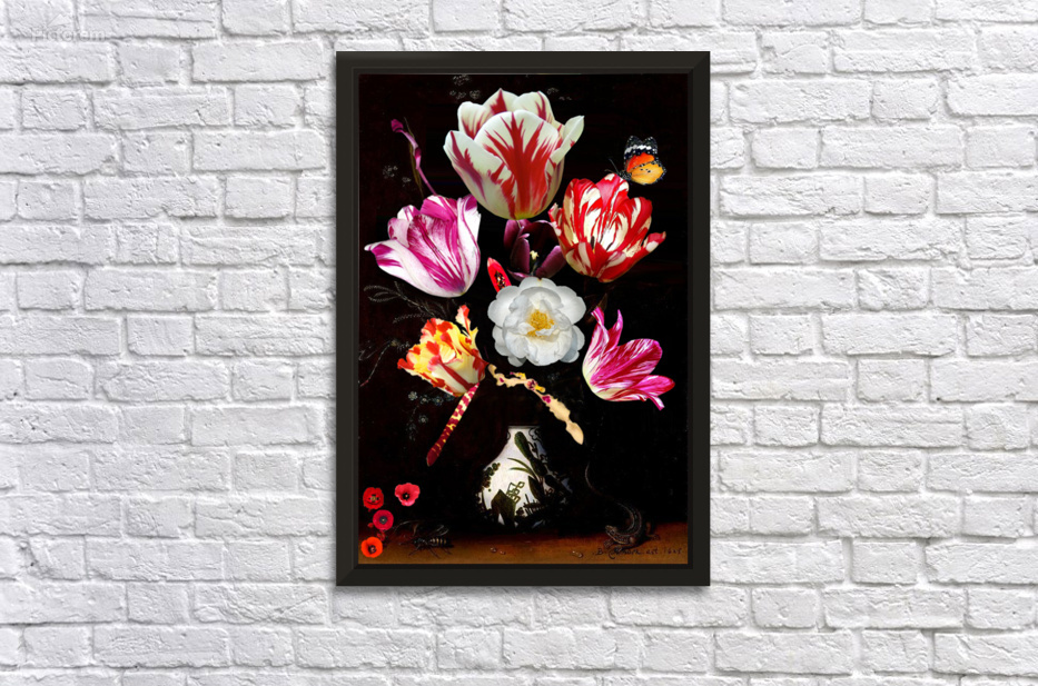 STILL LIFE WITH VARIEGATED TULIPS IN A CERAMIC VASE WITH A WASP DRAGONFLY BUTTERFLY & LIZARD Picture Frame Printing