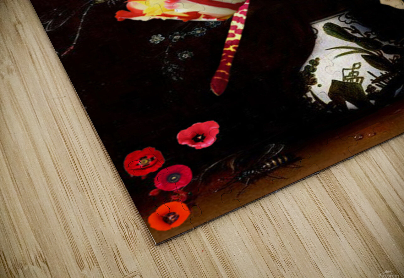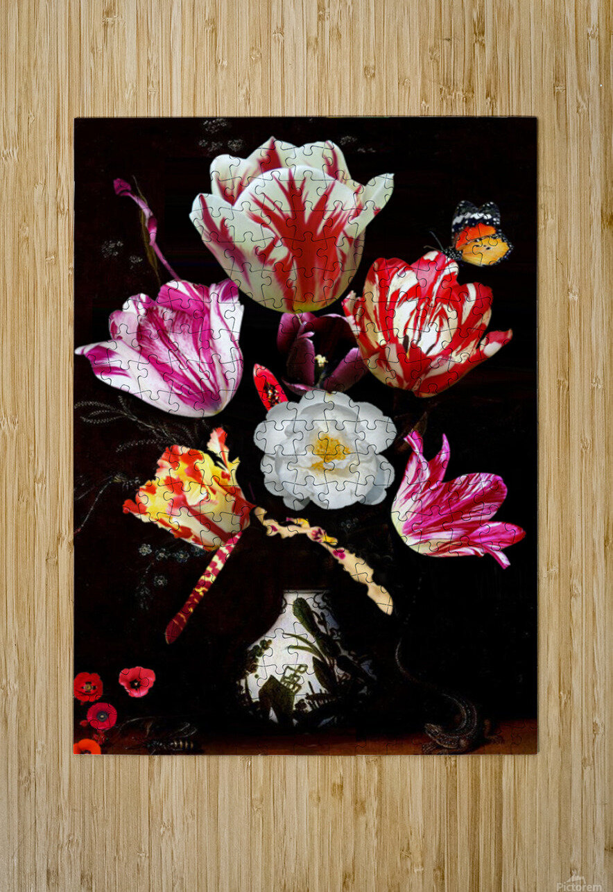 STILL LIFE WITH VARIEGATED TULIPS IN A CERAMIC VASE WITH A WASP DRAGONFLY BUTTERFLY & LIZARD Gerry Chapleski Puzzle printing