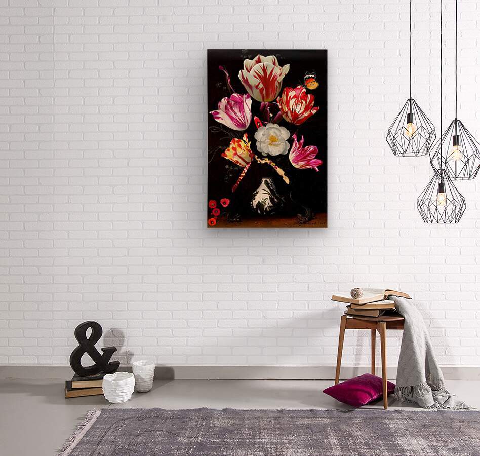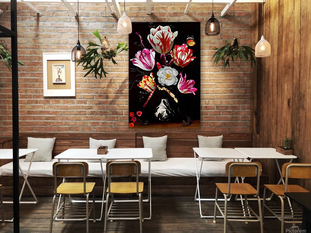 STILL LIFE WITH VARIEGATED TULIPS IN A CERAMIC VASE WITH A WASP DRAGONFLY BUTTERFLY & LIZARD Canvas print