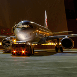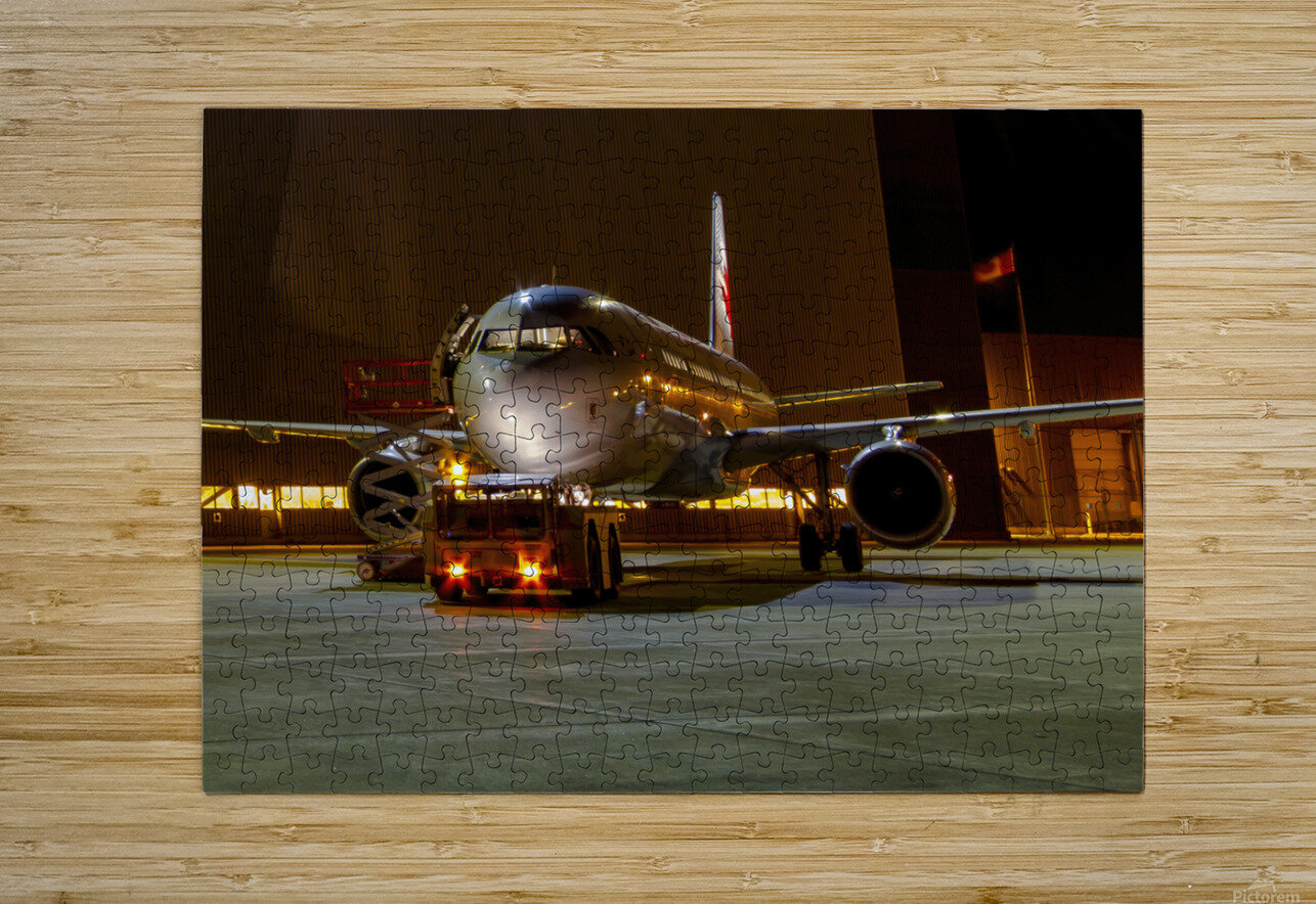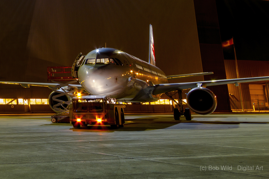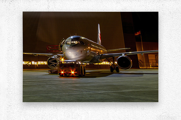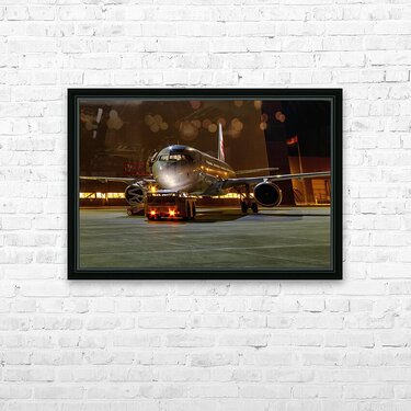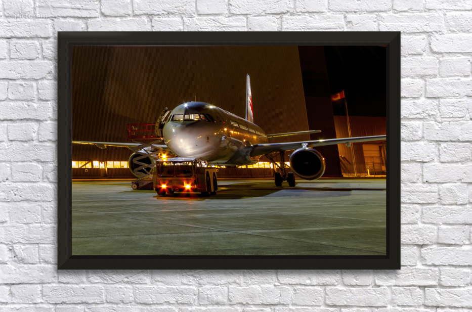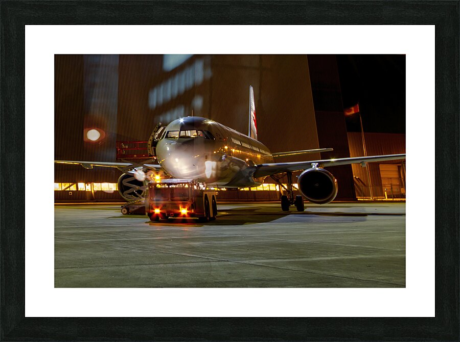 This photograph titled "A Midnight Inspection: Aircraft Maintenance Under the Stars" captures an air bus undergoing last-minute checks by a hangar with a tug at night. The image highlights the meticulous process of preparing a plane for release from maintenance, with the bright lights adding a sense of drama and intensity to the scene. It's a testament to the hard work and dedication of the individuals involved in ensuring the safety and smooth operation of air travel.