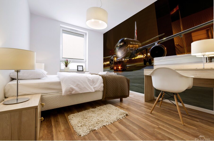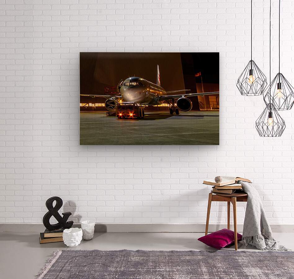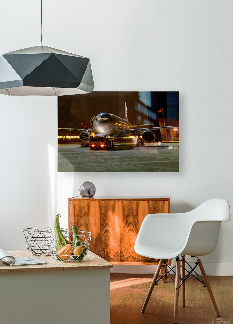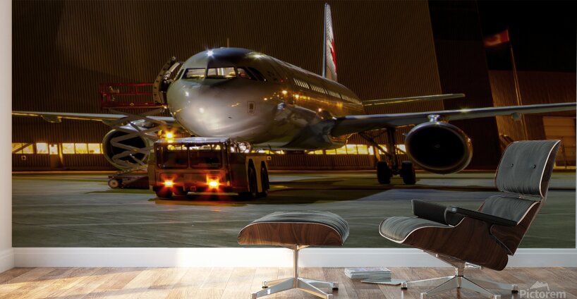This photograph titled "A Midnight Inspection: Aircraft Maintenance Under the Stars" captures an air bus undergoing last-minute checks by a hangar wit...[+]