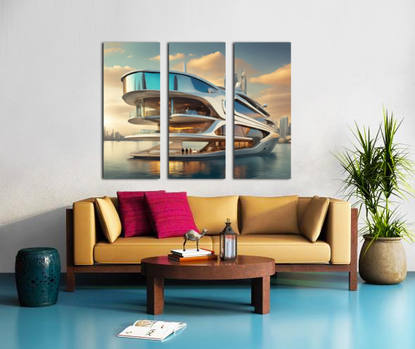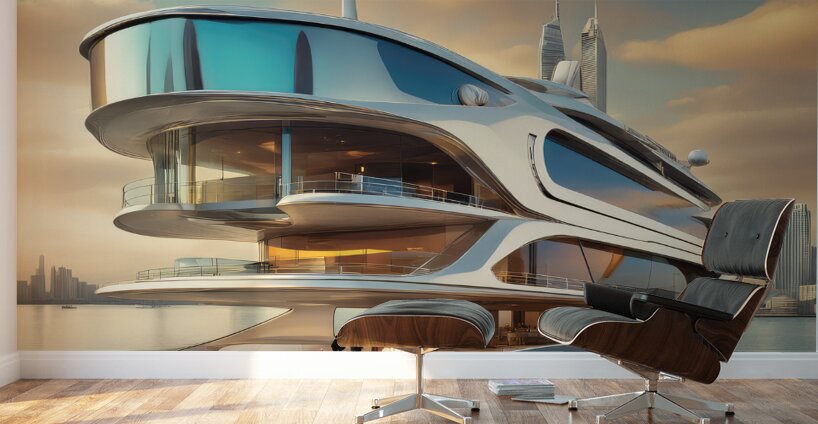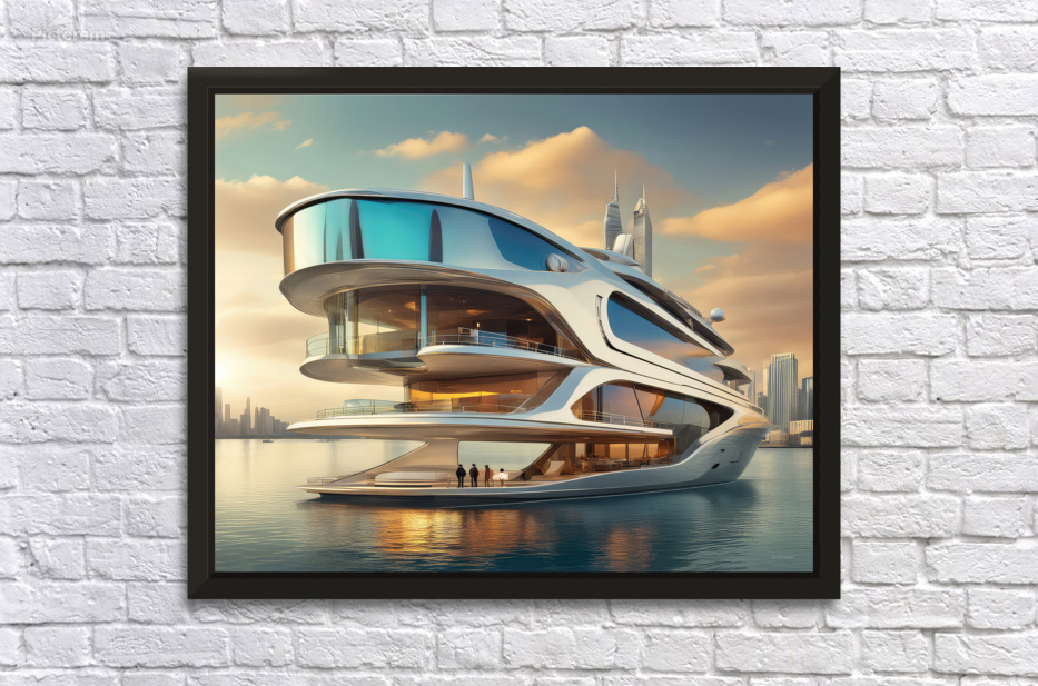 CONCEPT OF A FUTURISTIC BILLIONAIRES YACHT. BUILT OF STAINLESS STEEL , TINTED BULLETPROOF GLASS, HELICOPTER PORT ON ROOF, BUILT IN SWIMMING POOL.REAR FOURTH LEVEL PENTHOUSE. A I GENERATED.