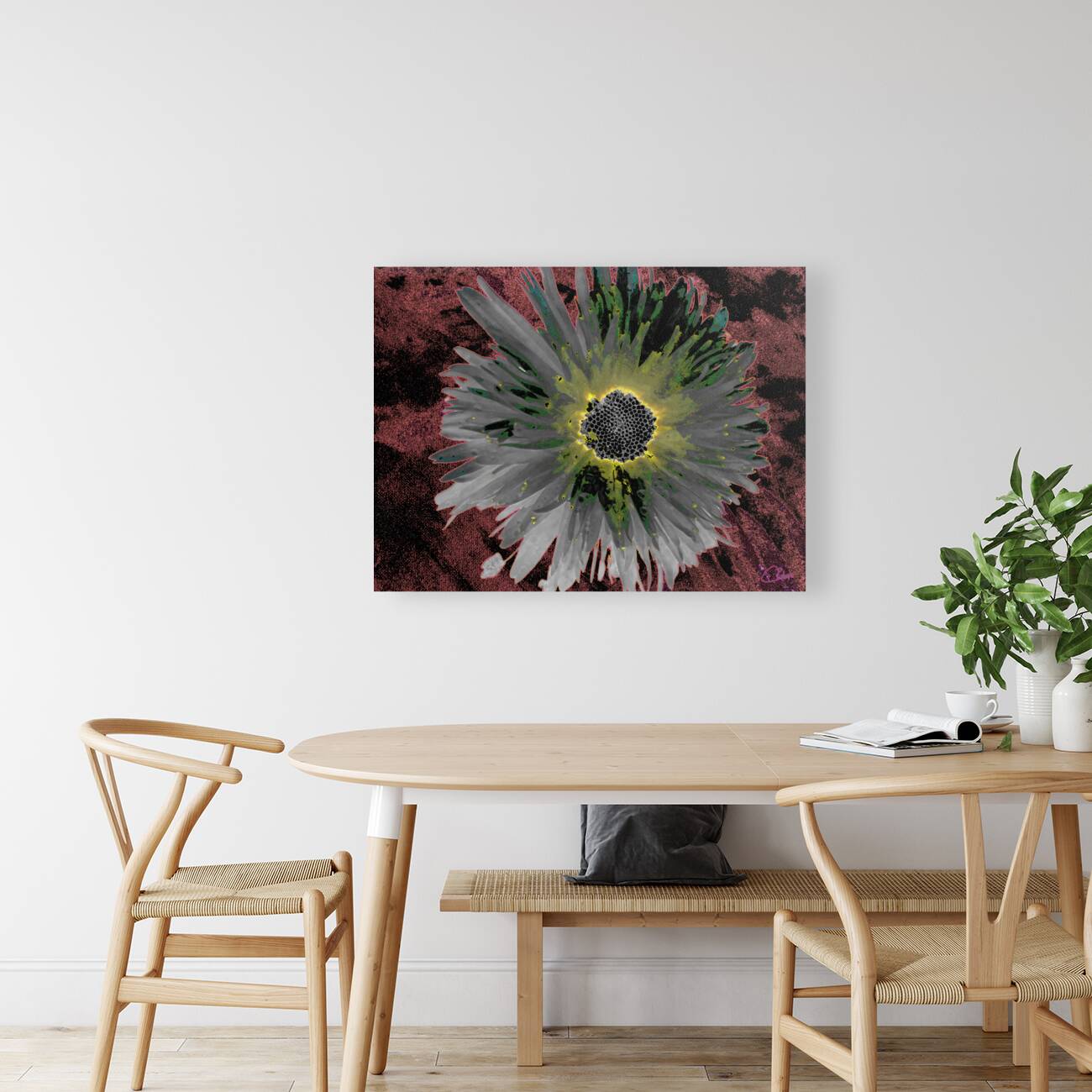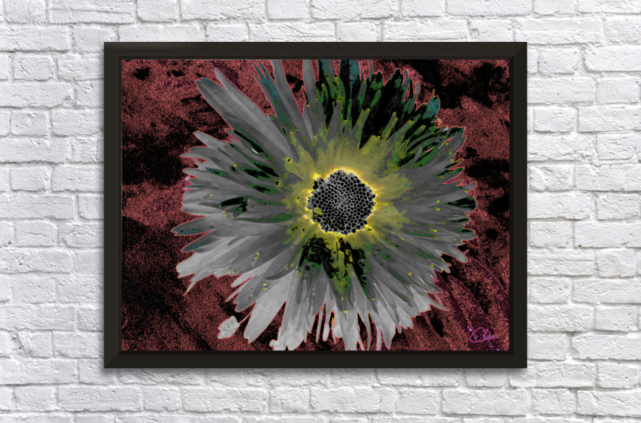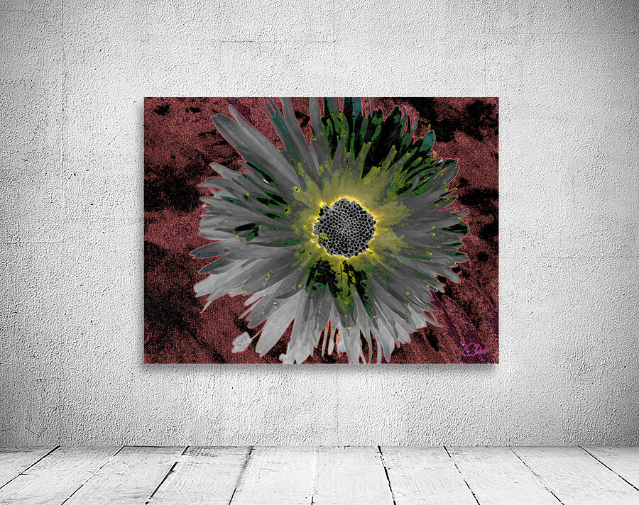 Two designs fused together, a close up photo of a Daisy flower with an abstract acrylic, via digital manipulation using various modalities ( including the Magic AI Background Remover in Canva.com) enabled this dramatic digital Daisy art work to emerge.