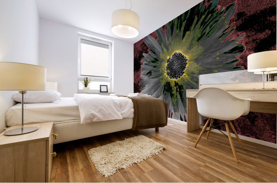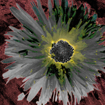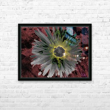 Two designs fused together, a close up photo of a Daisy flower with an abstract acrylic, via digital manipulation using various modalities ( including...[+]