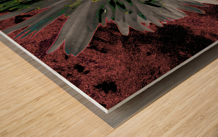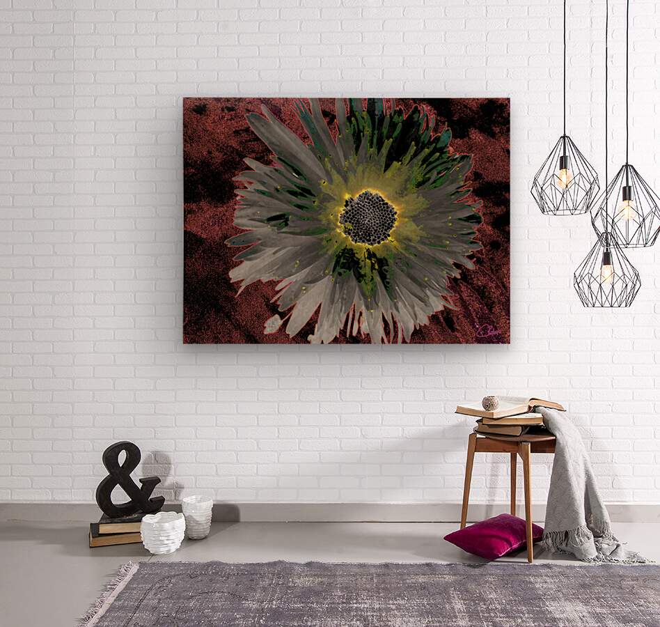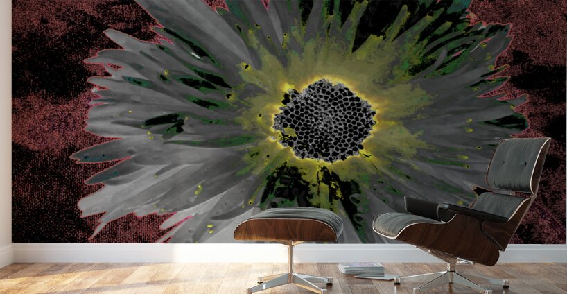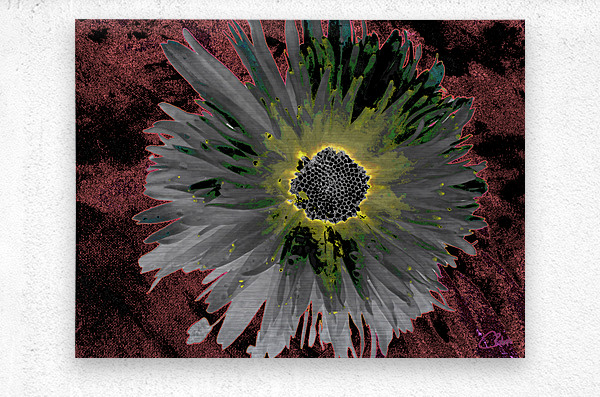 ABOUT THIS ARTWORK: ABSTRACT SILVER AND GREEN DISTRESSED DAISY FLOWER ON A DARK ABSTRACT BACKGROUND