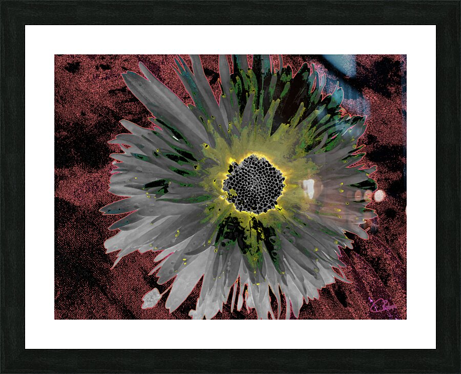 Abstract Silver and Green Distressed Daisy Flower on a Dark Abstract Background Picture Frame Printing