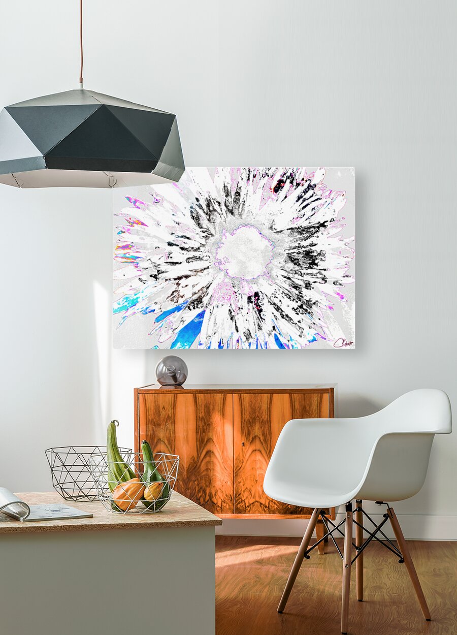 Two designs combined, a close up photo of a Daisy flower with an abstract acrylic, via digital manipulation using various modalities (including the Magic Background Remover in Canva.com) allowed this striking abstract digital floral art work to emerge.