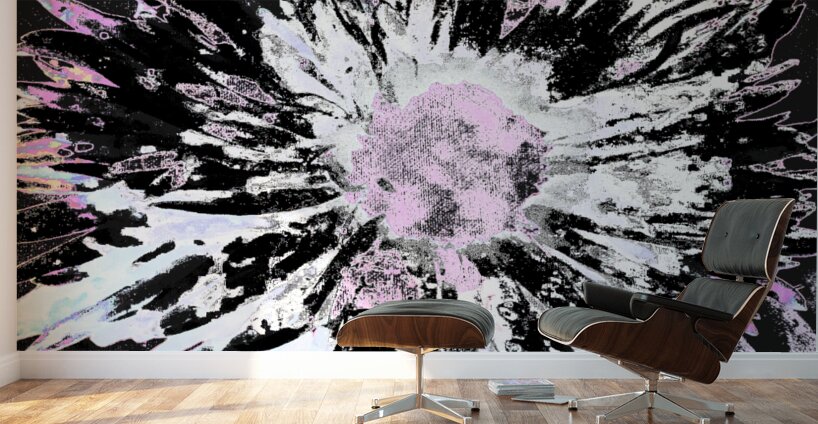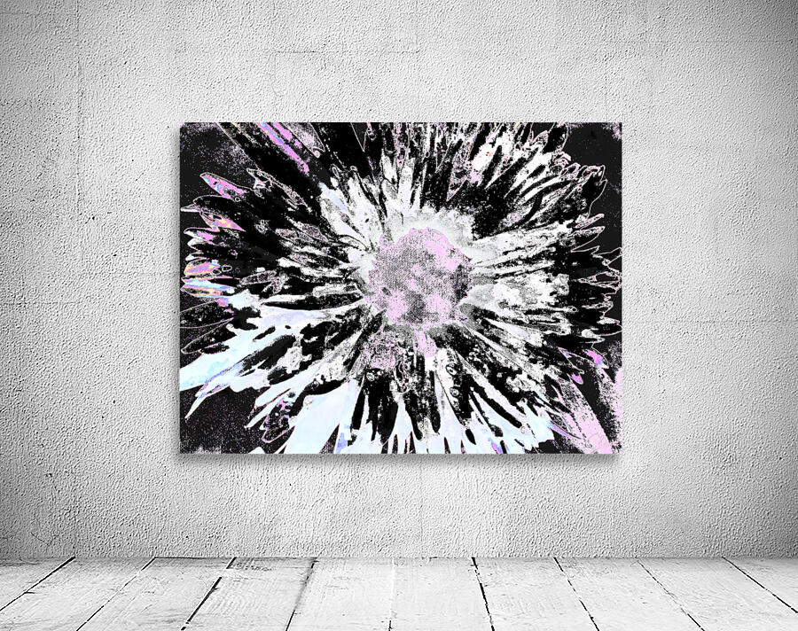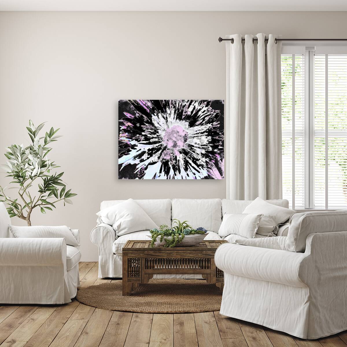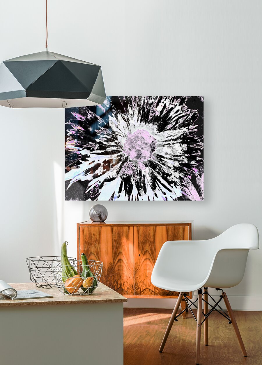White neon pink and violet daisy on an abstract Version 10 Originally a hand painted acrylic and a close up photo of a Daisy flower, laterally combined and digitally manipulated using various modalities (including Magic Background Remover in Canva) to create a modern, contemporary, mixed medium floral digital art design.