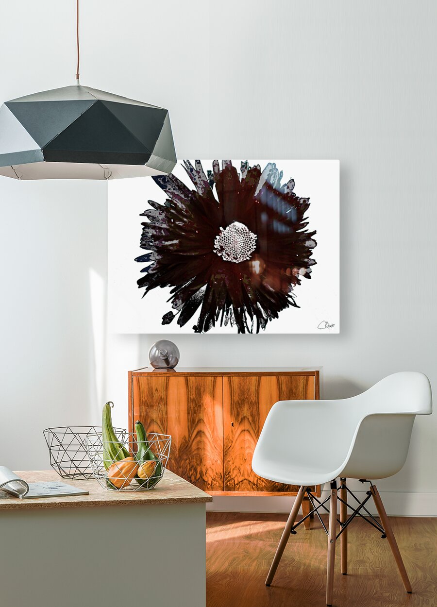 ABOUT THIS ARTWORK: DARK BURGUNDY DISTRESSED DAISY ON A PALE ABSTRACT BACKGROUND