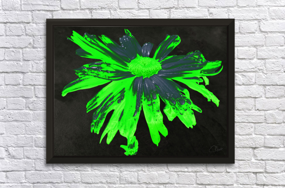 Abstract Neon Green Daisy Flower on a Dark Abstract Background  Frame print