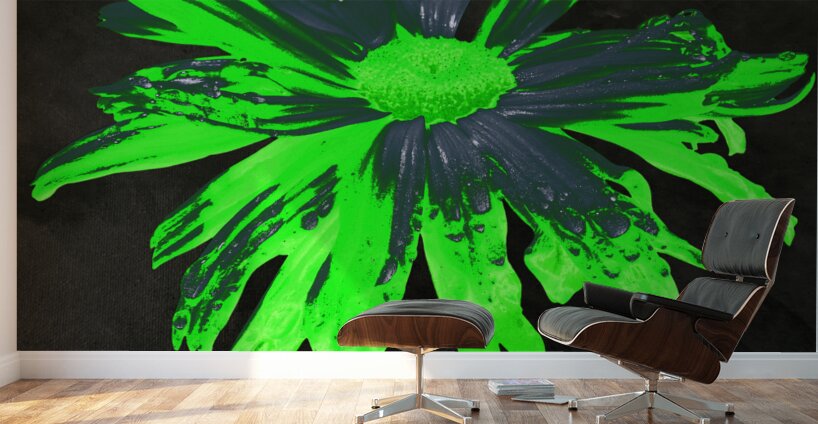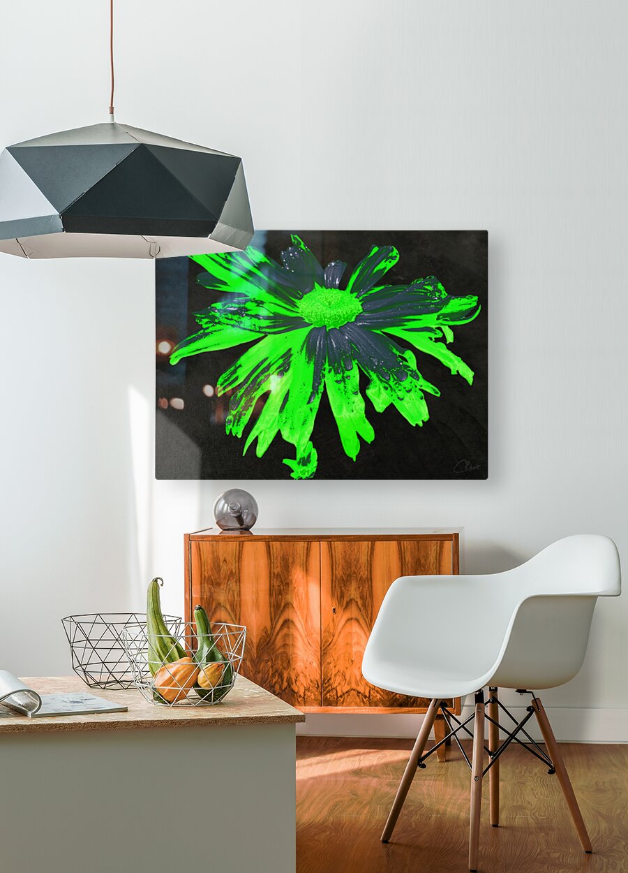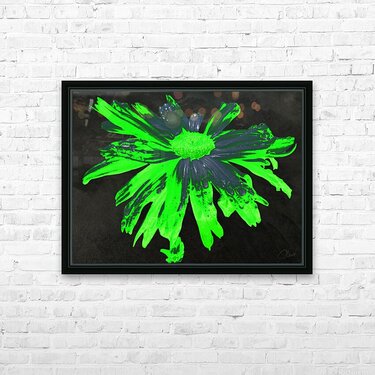 Abstract Neon Green Daisy Flower on a Dark Abstract Background  Wall Decor Frame