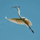 GREAT EGRET BALANCES A LARGE BRANCH IN FLIGHT RETURNING TO BUILD IT'S NEST.