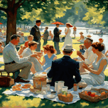 IMPRESSIONIST PAINTING OF A PICNIC AT THE LAKE.