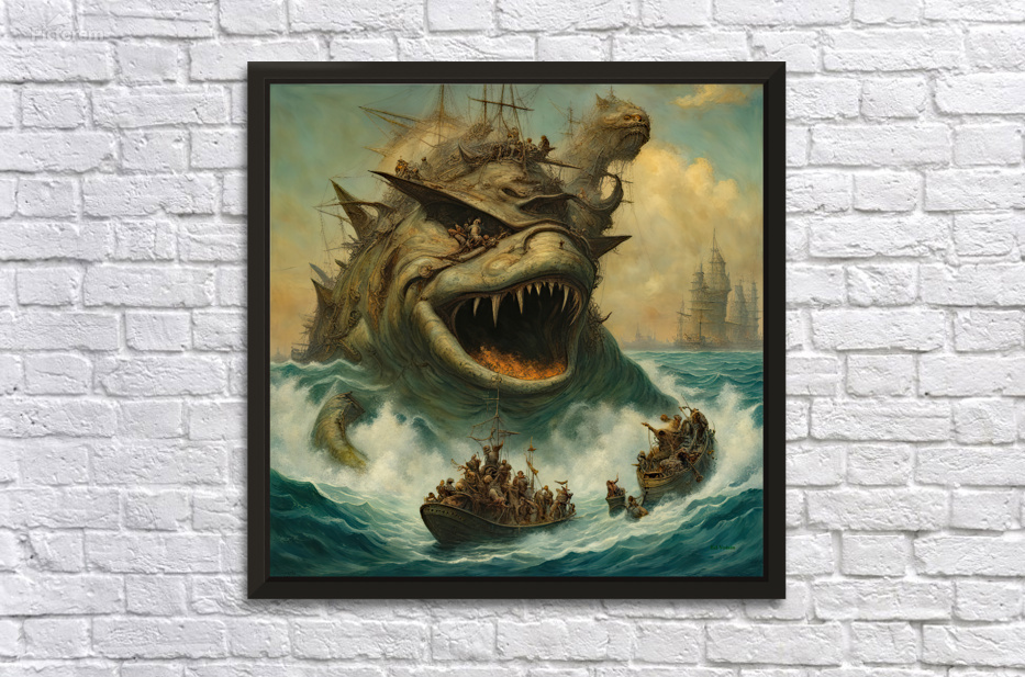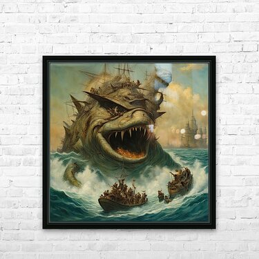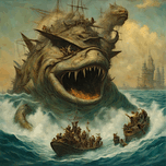 FANTASY GENERATED IMAGE OF SERPENT SHIP 3. THIS ONE LOOKS LIKE IT COULD BE TROUBLE. SEEMS AS THOUGH CREW IN NET SKIFFS ARE FLEEING.
