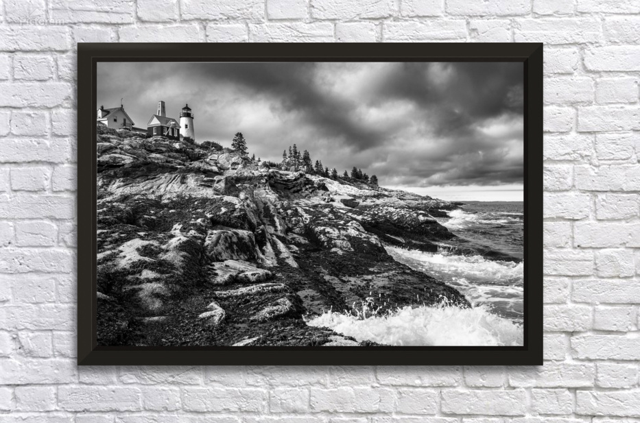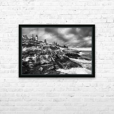 Rocky Shoreline by Pemaquid Lighthouse at Low Tide in Maine - B&W Wall Decor Frame