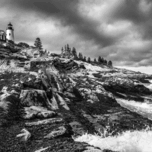 Black and white photo of barnacle-covered rocks at low tide by Pemaquid Point Lighthouse in mid coast Maine. It is a favorite Maine summer attraction.