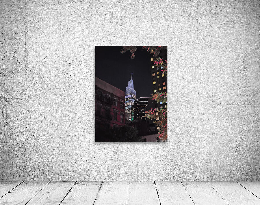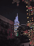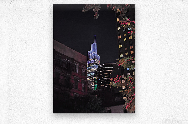 The image presents a striking night scene from Manhattan, capturing the essence of New York's vibrant urban life. In the foreground, the older, classic architecture of residential buildings, characterized by their brick facades and fire escapes, stands in contrast to the background. Peeking through this familiar New York tableau is the illuminated One Vanderbilt building, a modern skyscraper that towers confidently above the cityscape. The scene is framed by the organic silhouettes of tree branches, softly lit by the ambient urban glow, adding a touch of nature to the composition. The One Vanderbilt stands out as a beacon of contemporary design, with its lights accentuating the building's sleek, tiered structure that cuts into the night sky. The photograph captures the juxtaposition between the everyday scenery of street-level New York and the aspirational heights of its newer, towering constructions. The image evokes the layered complexity of Manhattan, where history and progress coexist in a delicate balance. The lighting conditions emphasize the different eras represented in the scene—dimly lit windows of apartments signaling the personal, private lives of New Yorkers, against the backdrop of the bright, almost futuristic luminescence of One Vanderbilt. It's a snapshot of the city's relentless pulse, where life goes on amidst the ever-evolving architectural tapestry of one of the world's most iconic cities.