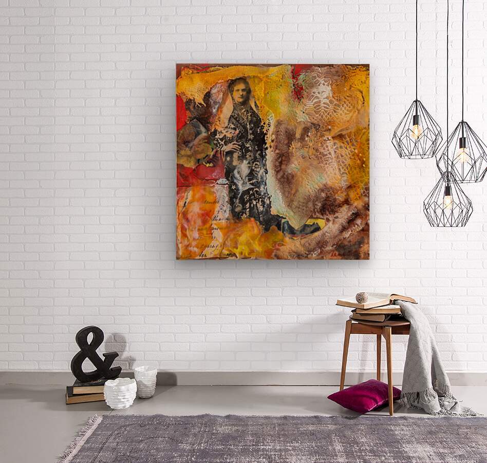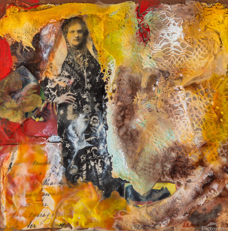Esta arte foi feita com colagens de tecidos pintados , rendas fotos e tinta acrílica e cera