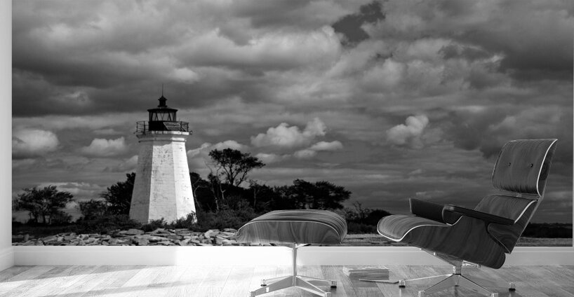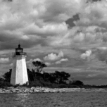 Black and white photo of Black Rock Harbor lighthouse, also referred to as Fayerweather Island lighthouse, illuminated by the sun though thick storm c...[+]