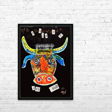 Taurus The Bull. April 20 - May 20 Taurus is the second astrological sign in the modern zodiac. It spans from 30° to 60° of the zodiac. This sign belongs to the Earth element or triplicity, as well as a fixed modality, quality, or quadruplicity. It is a Venus-ruled sign, the Moon is in its exaltation here at exactly 3°. The Sun transits this sign from approximately April 20 until May 20 in western astrology. Taurus is one of the three earth signs, alongside Capricorn and Virgo. Taurus's opposite sign is Scorpio. (Wikipedia) Acrylic, Acrylic Pen, Black Permanent Marker, Pencil Newspaper Collage on Art paper - original size A3 Digitally enhanced.