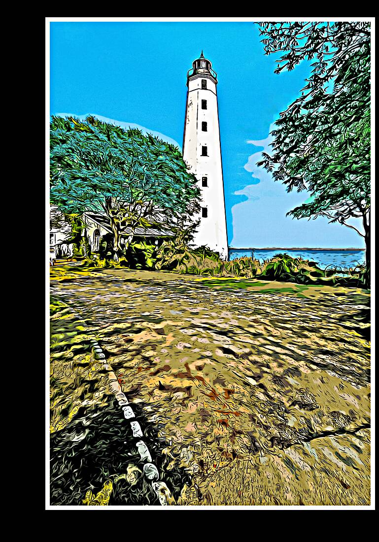 Digital illustrative painting of rustic New London Harbor Lighthouse tower in New London, Connecticut.